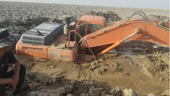 建設初期,項目部電路暫時不穩定,時常停電停水,項目團隊會時刻備著盒飯解決溫飽。但最大的問題是“地上的鹽殼厚得榔頭砸不動,往下半米就是鹽堿水,重型車輛稍微一壓就容易陷車。“我就暗自發誓,既然來了,就沒有回頭路,非要跟這‘死亡之海’磕出個結果不可!”項目經理劉信輝回憶道。時間緊任務重,項目團隊隻能先探、再走、再吊裝,把不確定性一一排除,用海上風電的換填法加固地基,硬生生在爛地裏淌出一條路。