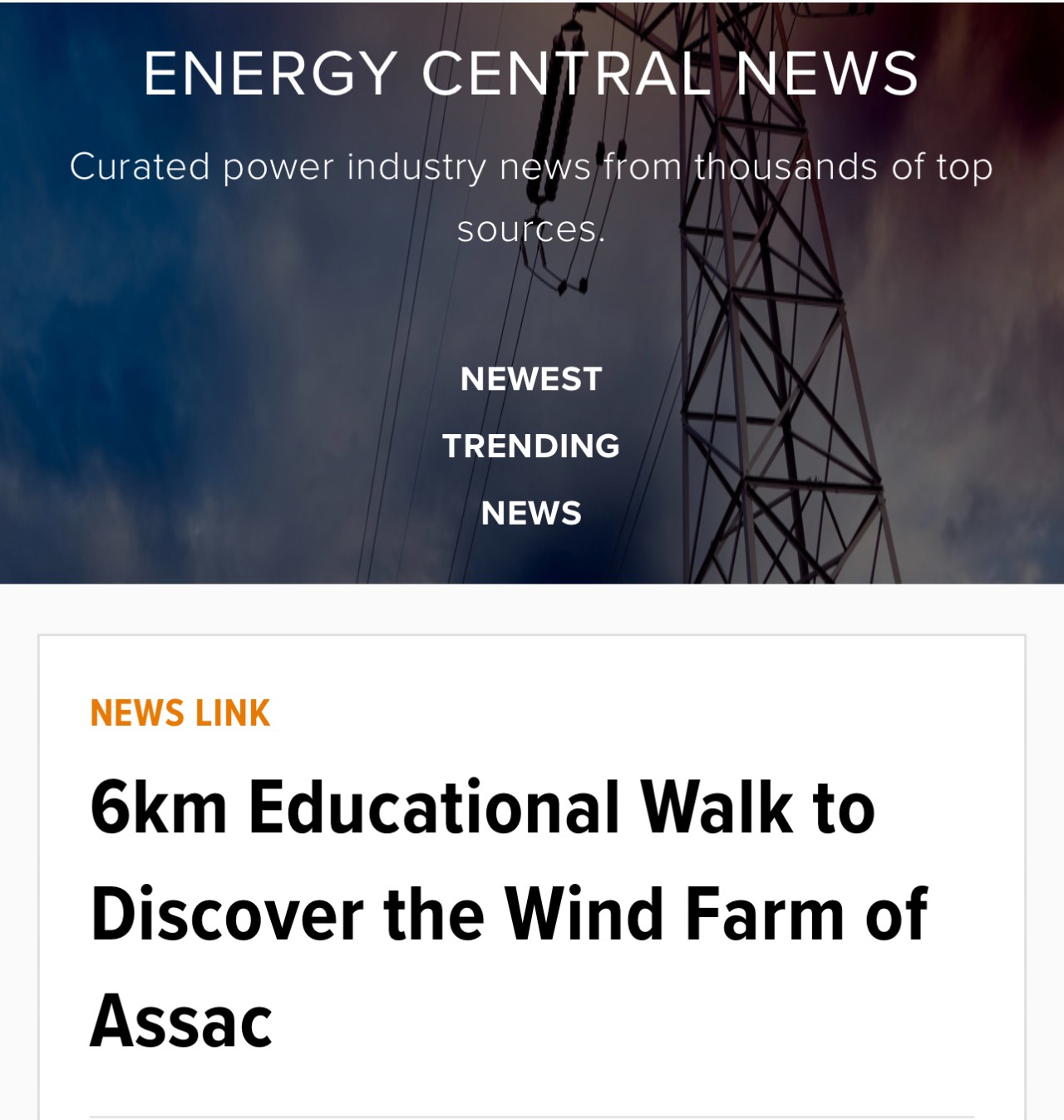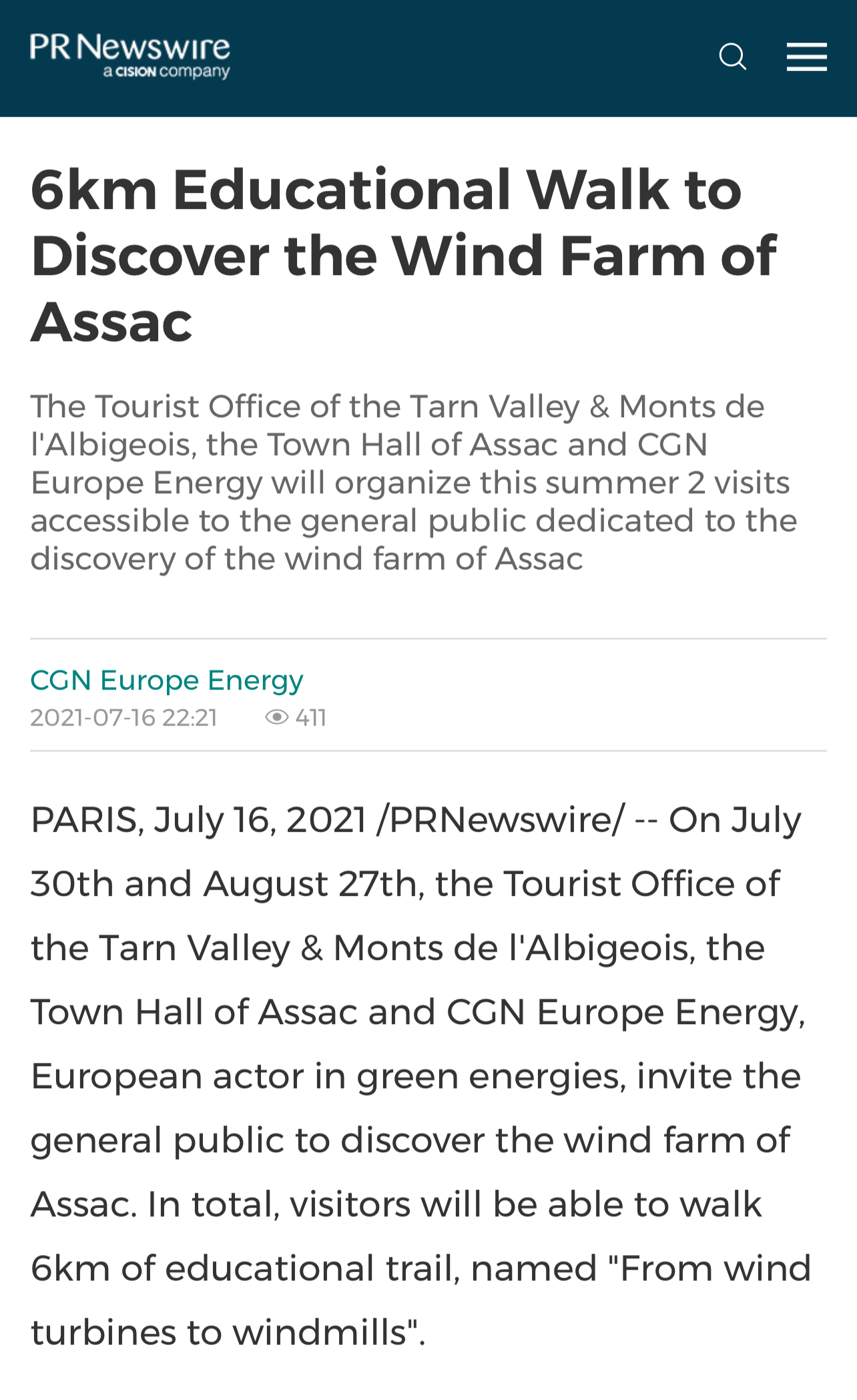英語行業性媒體《Energy Central News》報道中廣核歐能公司聯合塔恩河穀和阿爾比蓋奧山旅遊局和Assac市政府將在今年夏天開展的“探索風電場”為主題的公益性參觀活動。
