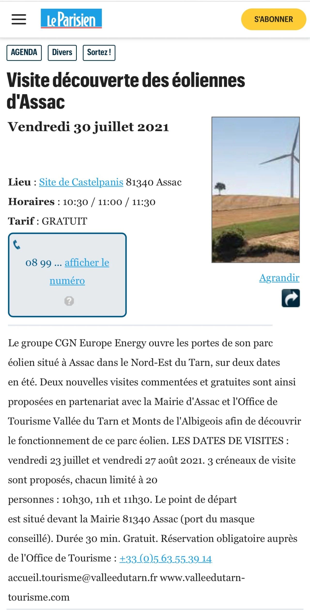 法國旅遊網站Losiramag刊登報道中廣核歐能公司聯合塔恩河穀和阿爾比蓋奧山旅遊局和Assac市政府將在今年夏天開展的“探索風電場”為主題的公益性參觀活動的旅遊信息。