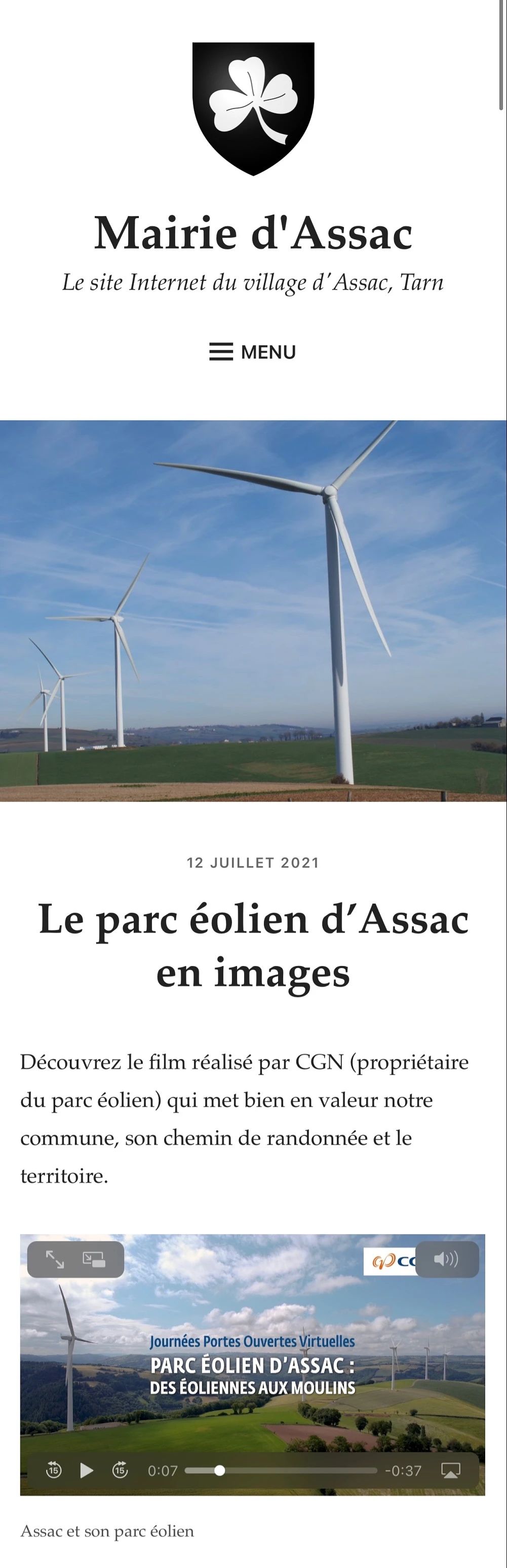 Assac市政府在其官方網站主頁發布中廣核歐能公司Assac風電場介紹,以及此次雲開放活動的視頻。