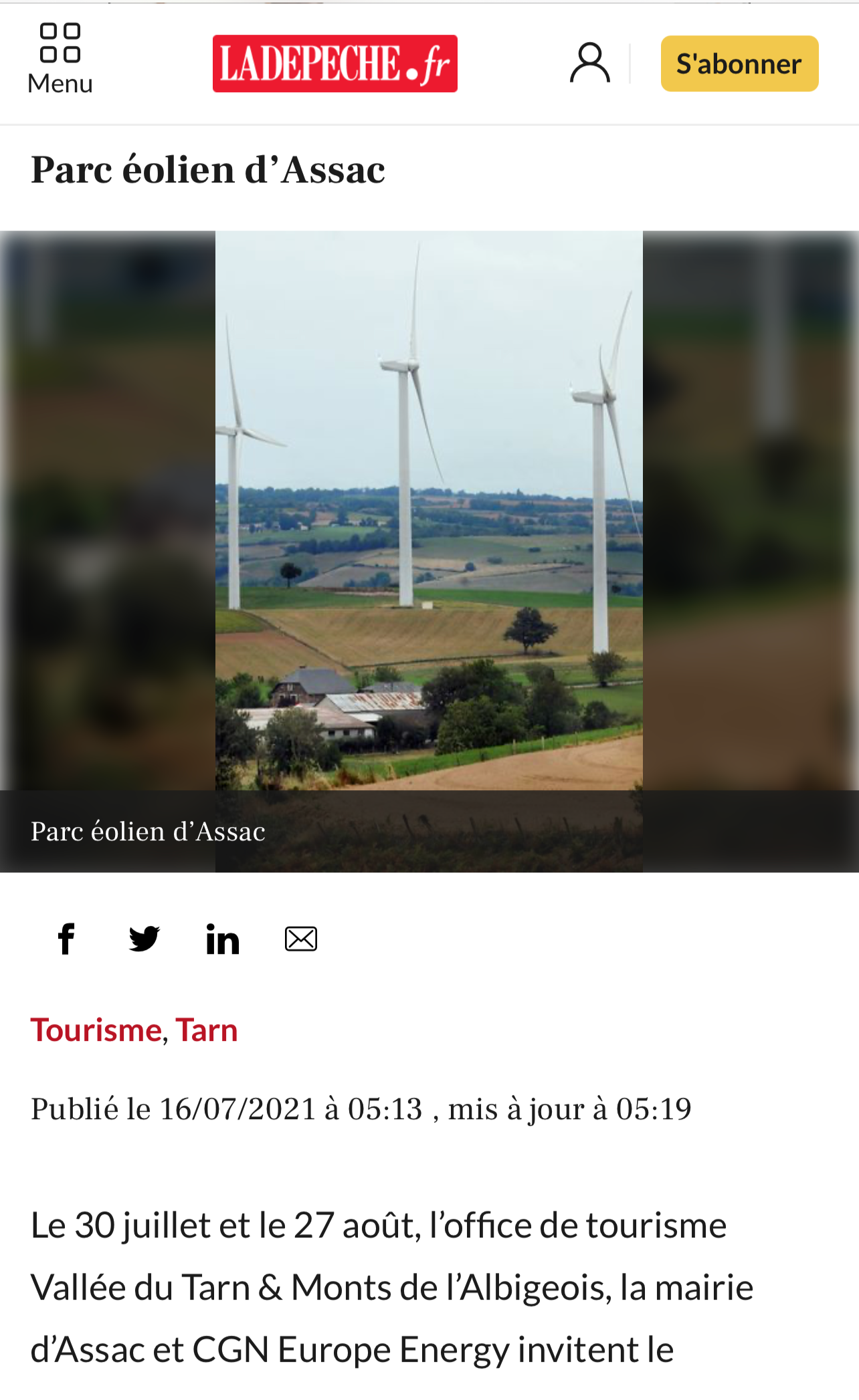 法國西南部地區性日報《快報》(La Dépêche)報道中廣核歐能公司聯合塔恩河穀和阿爾比蓋奧山旅遊局和Assac市政府將在今年夏天開展的“探索風電場”為主題的公益性參觀活動。該報讀者人數73萬。