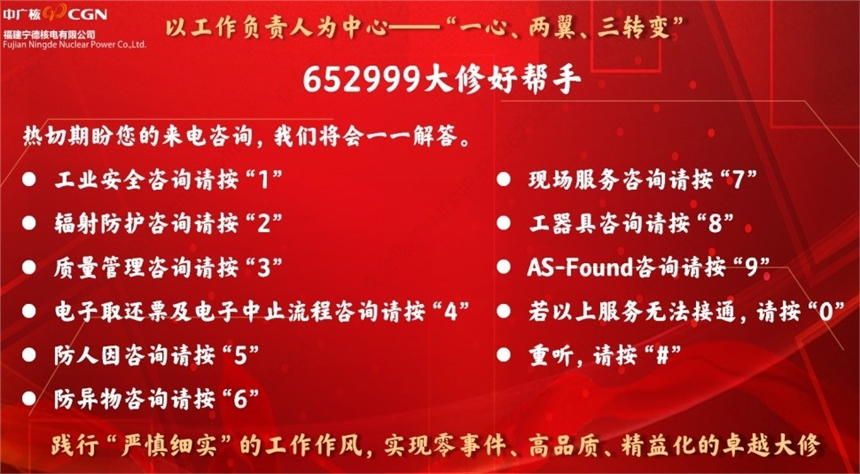 寧德核電開通“652999大修好幫手”一鍵式服務,由10餘個專業組成的“客服”團隊在大修期間24小時在線提供服務。在近期多個大修共提供電話服務502次、解決現場問題622項。隨後,又開通“123”照明服務熱線,至今已收到並解決73條缺陷,有效提升現場照明消缺響應速度。