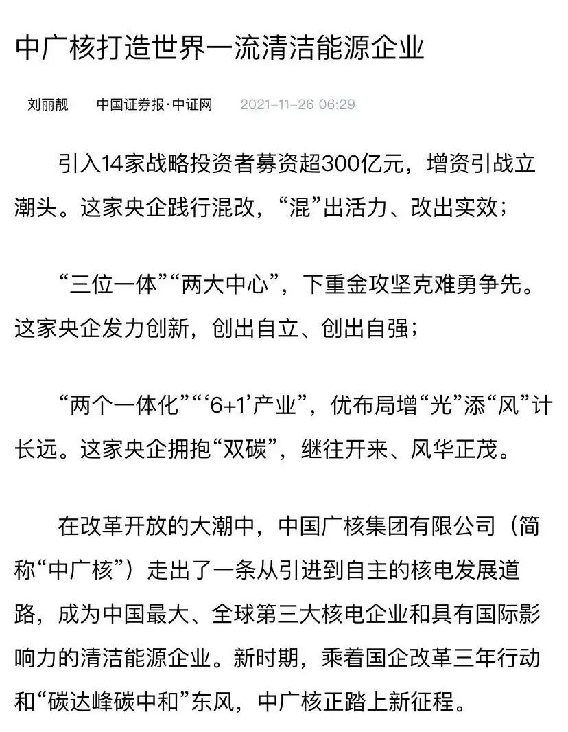 日前,《中國證券報》專訪中國廣核集團有限公司黨委書記、董事長楊長利,並發表文章《中廣核打造世界一流清潔能源企業》,從改革、創新、開新局三方麵講述中國廣核集團如何走出了一條從“引進來”到“自主創新”的核電發展道路,成為中國最大、全球第三大核電企業和具有國際影響力的清潔能源企業。