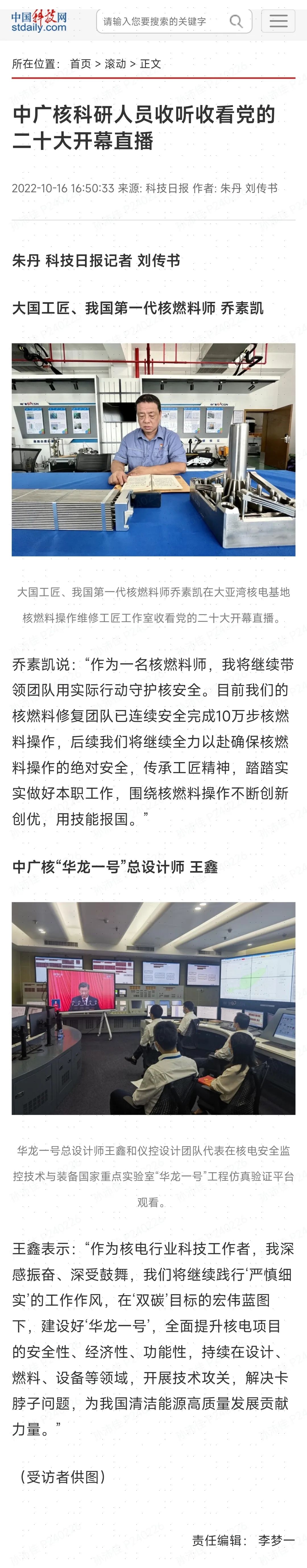 習近平總書記的報告裏提到“一些關鍵核心技術實現突破,戰略性新興產業發展壯大,載人航天、探月探火、深海深地探測、超級計算機、衛星導航、量子信息、核電技術、大飛機製造、生物醫藥等取得重大成果”,這令我倍受鼓舞。作為一名核電工作者,我要堅持守正創新,堅持問題導向,守護好核安全,積極參與核電領域重大技術攻堅戰,以“釘釘子”的精神潛心鑽研燃料組件檢測等新技術難題,不斷提出新方案、新方法,努力為中廣核核電事業踏上新征程、開創新局麵作出更大貢獻。