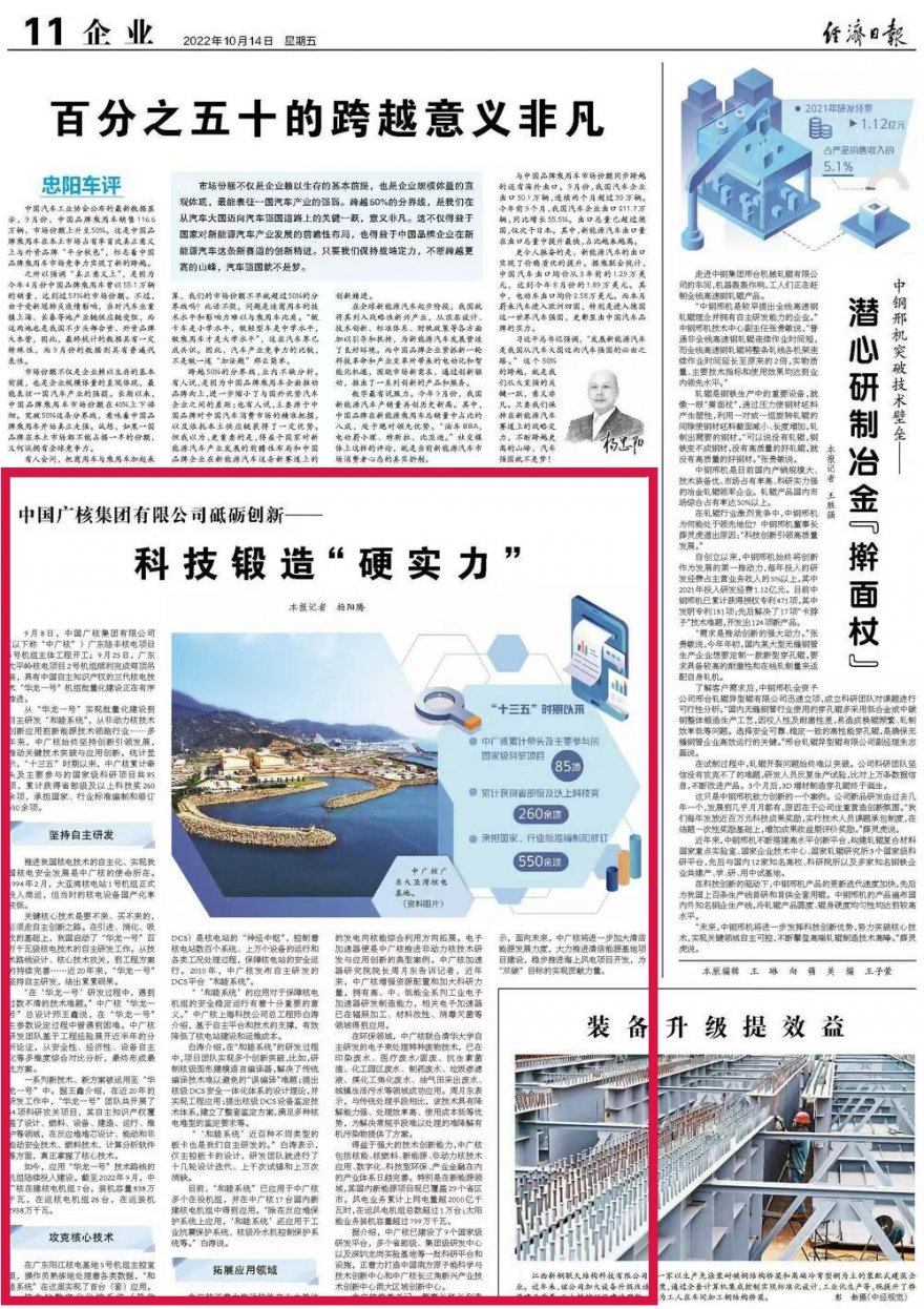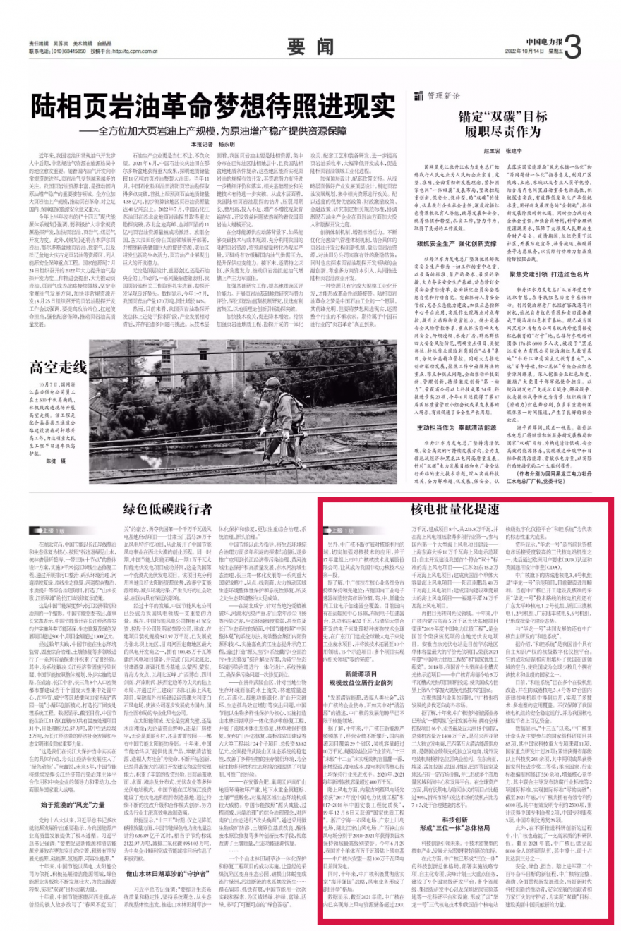 10月20日,人民日報以《走清潔能源發展之路》為題,聚焦報道中廣核堅持科技引領、推動綠色發展所取得的一係列成績。經濟日報、中國電力報等媒體聚焦報道中廣核近十年來在科技創新、核電批量化建設等方麵的發展成果。