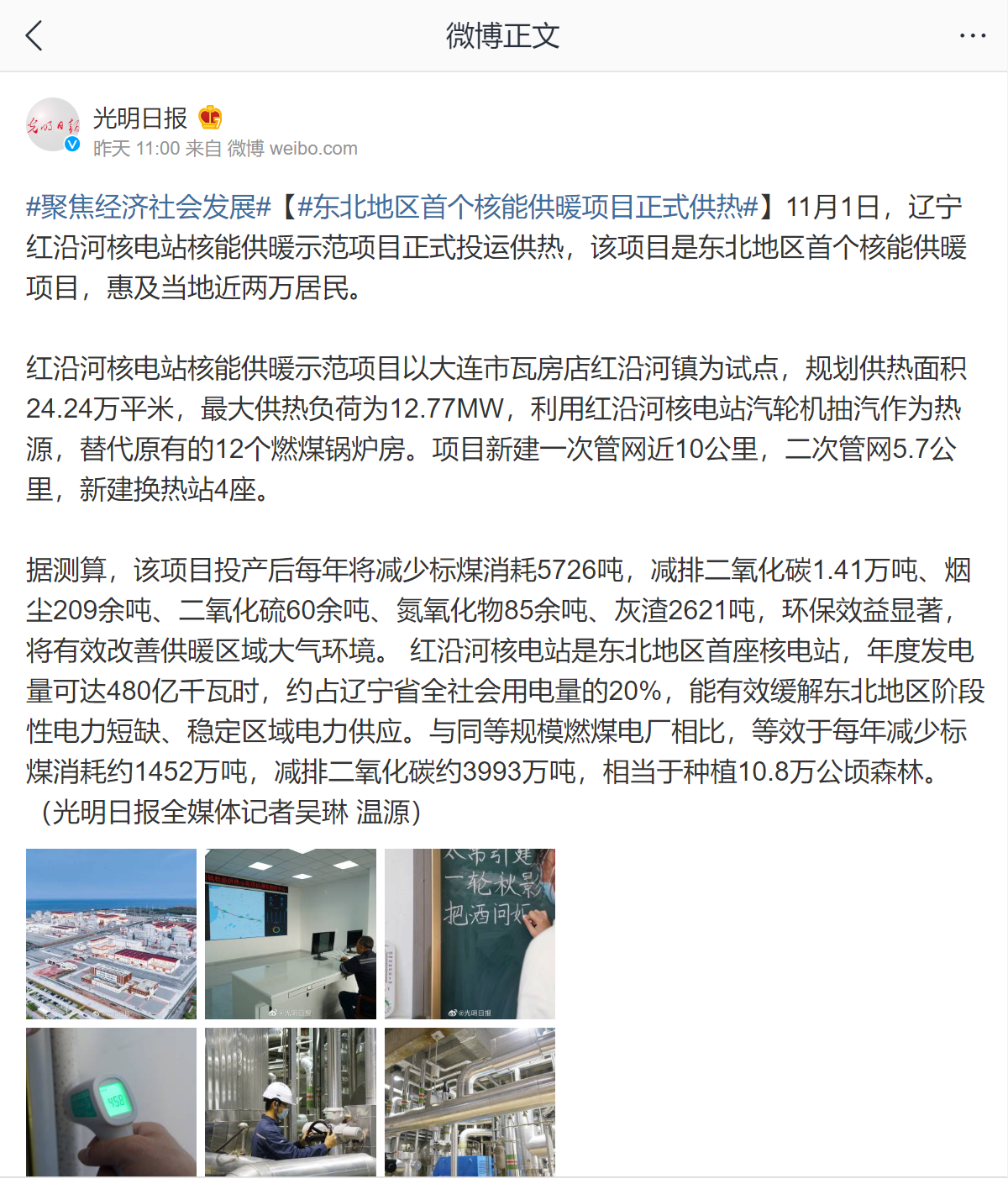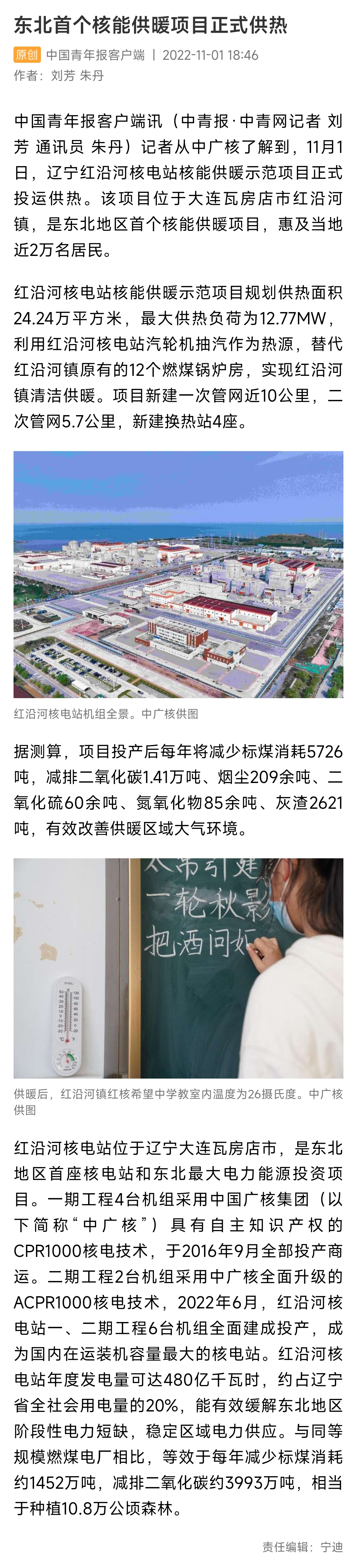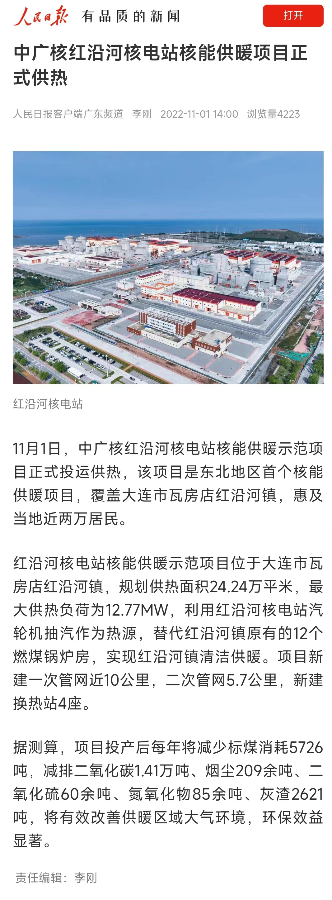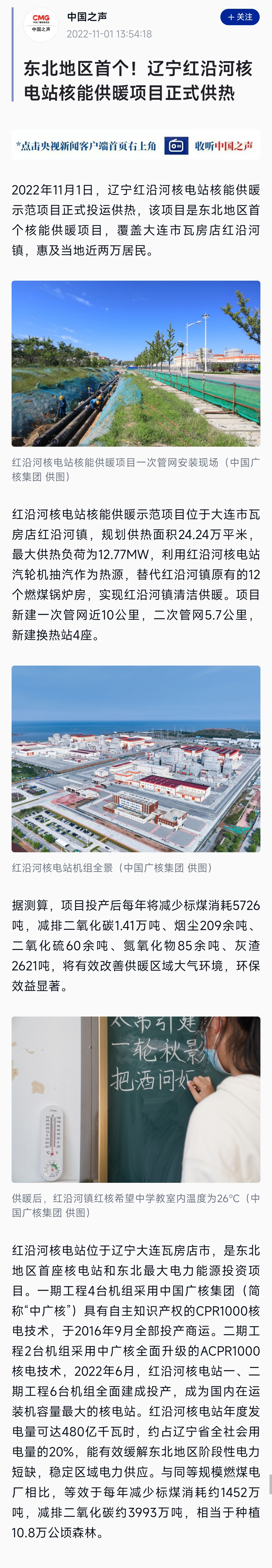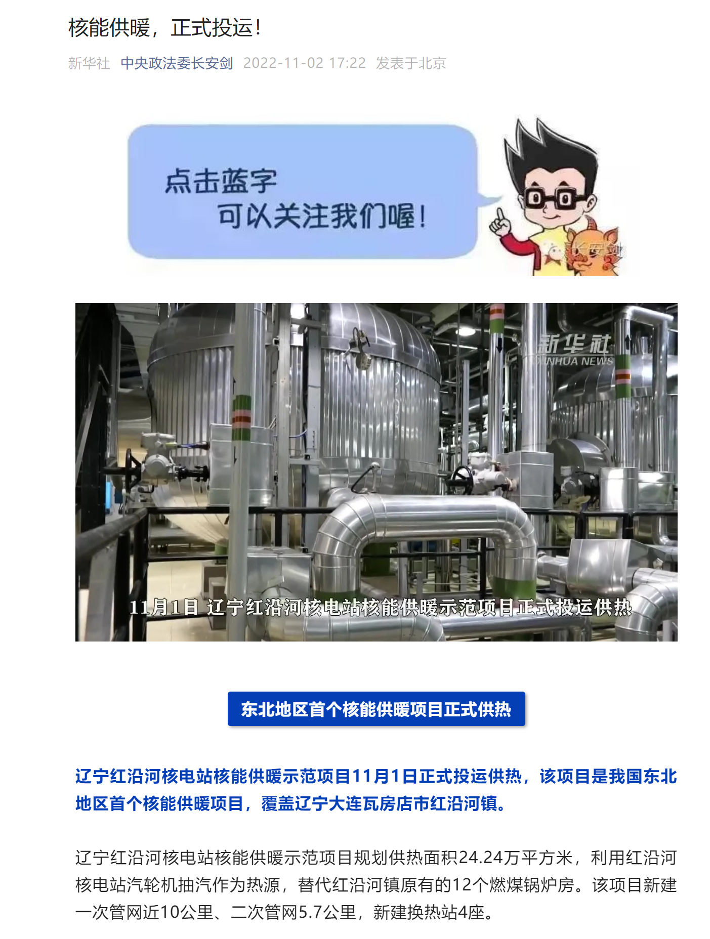11月1日(ri),遼(liao)寧(ning)紅(hong)沿(yan)河(he)核(he)電(dian)站(zhan)核(he)能(neng)供(gong)暖(nuan)示(shi)範(fan)項(xiang)目(mu)正(zheng)式(shi)投(tou)運(yun)供(gong)熱(re),該(gai)項(xiang)目(mu)是(shi)東(dong)北(bei)地(di)區(qu)首(shou)個(ge)核(he)能(neng)供(gong)暖(nuan)項(xiang)目(mu),覆(fu)蓋(gai)大(da)連(lian)市(shi)瓦(wa)房(fang)店(dian)紅(hong)沿(yan)河(he)鎮(zhen),惠(hui)及(ji)當(dang)地(di)近(jin)兩(liang)萬(wan)居(ju)民(min)。