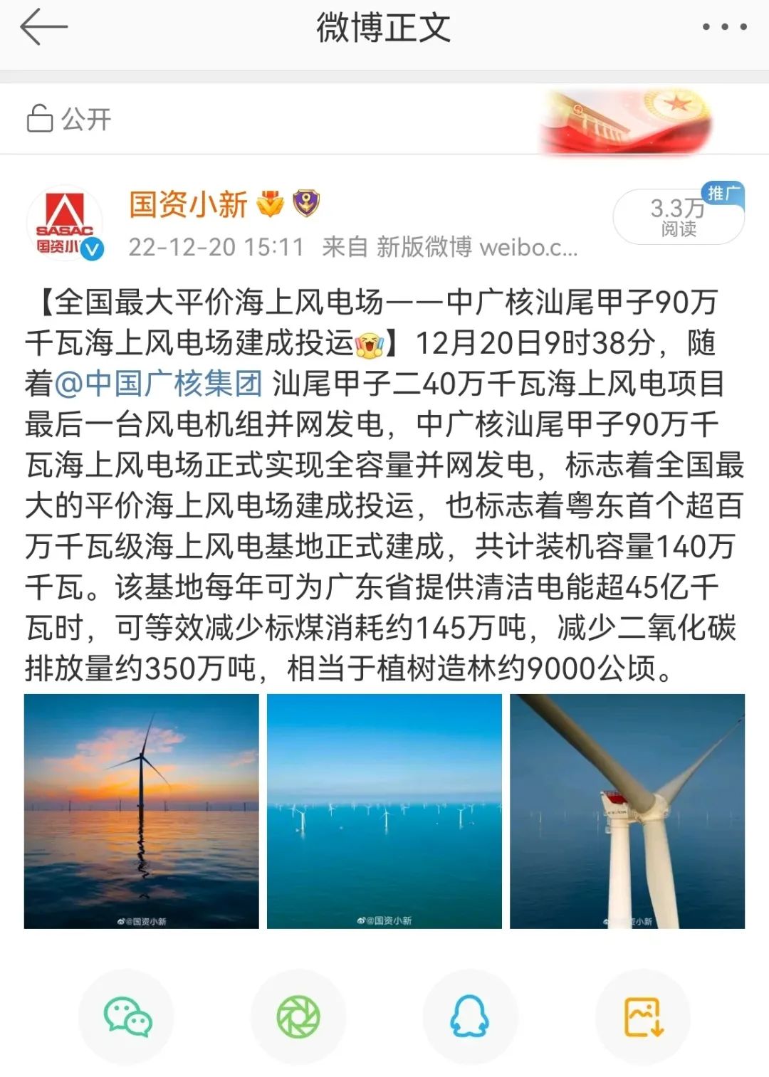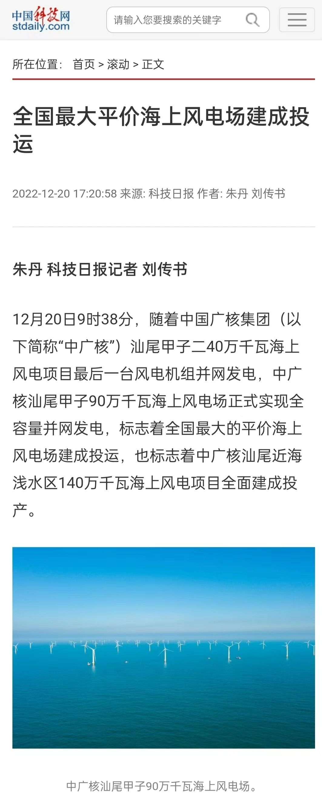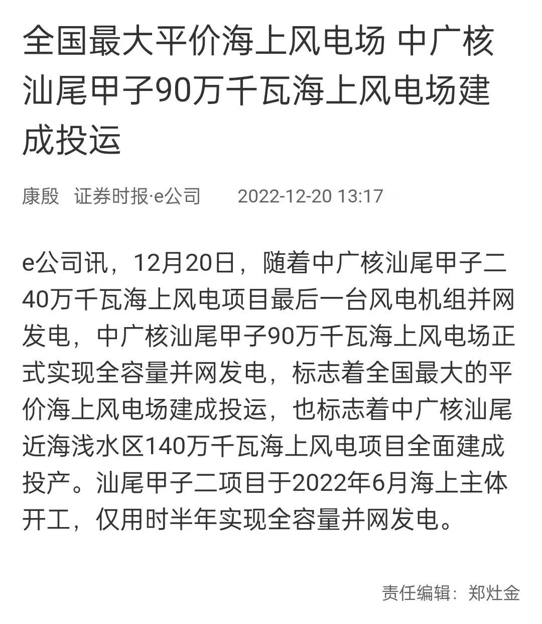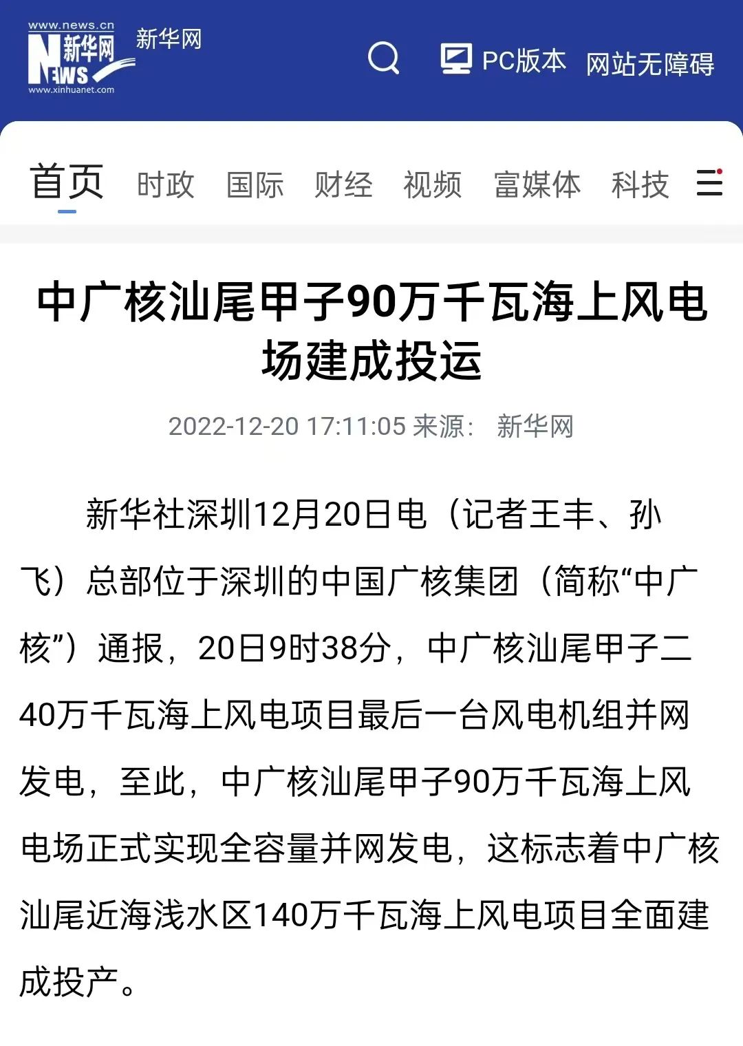 12月20日9時38分,隨著中國廣核集團(簡稱“中廣核”)汕尾甲子二40萬千瓦海上風電項目最後一台風電機組並網發電,中廣核汕尾甲子90萬千瓦海上風電場正式實現全容量並網發電,標誌著全國最大的平價海上風電場建成投運,也標誌著中廣核汕尾近海淺水區140萬千瓦海上風電項目全麵建成投產。