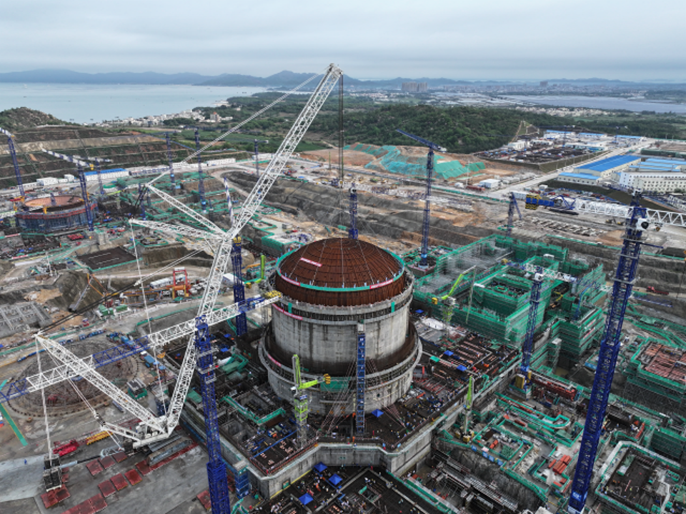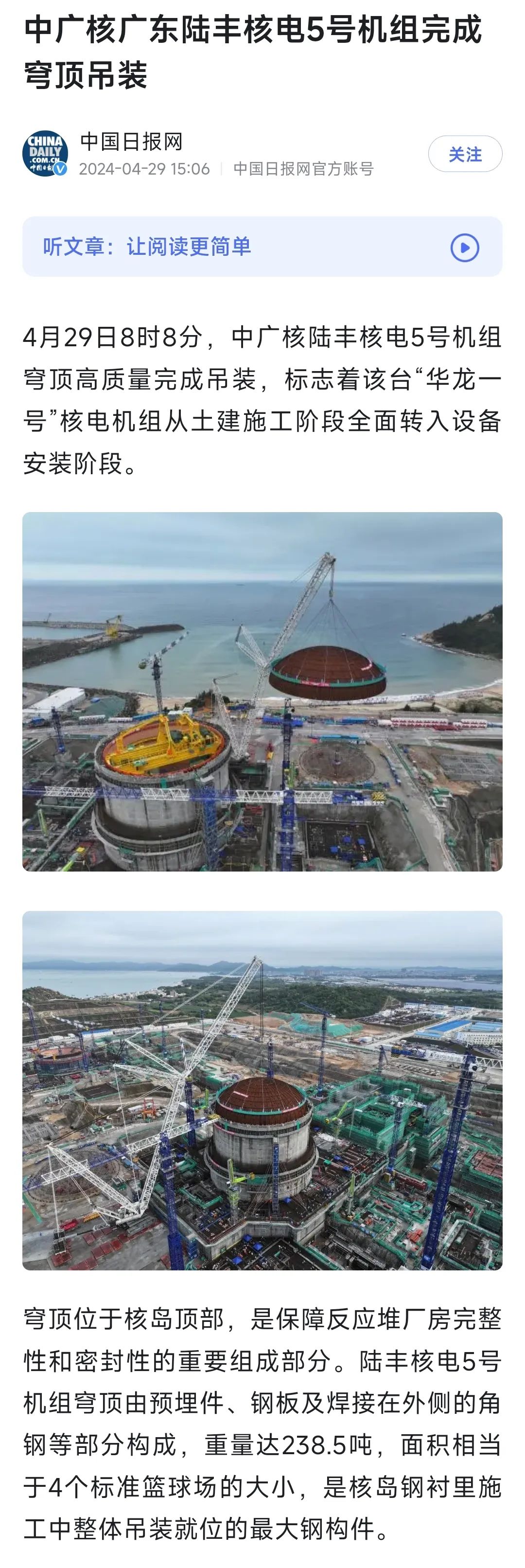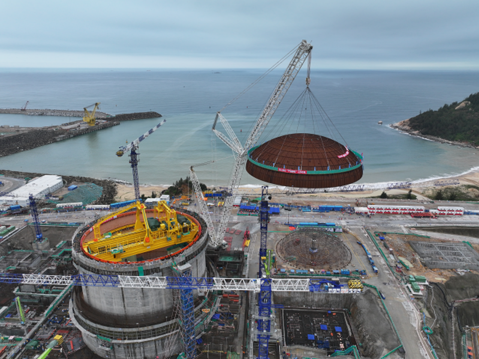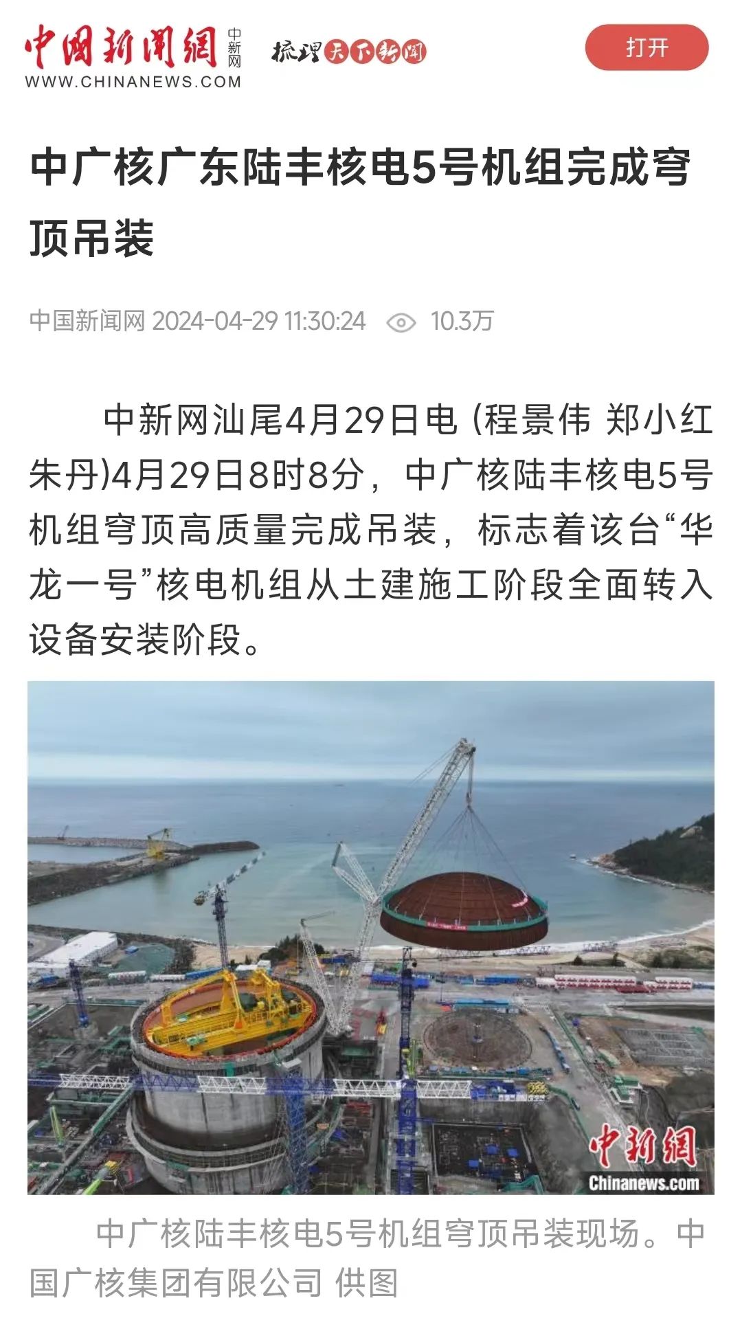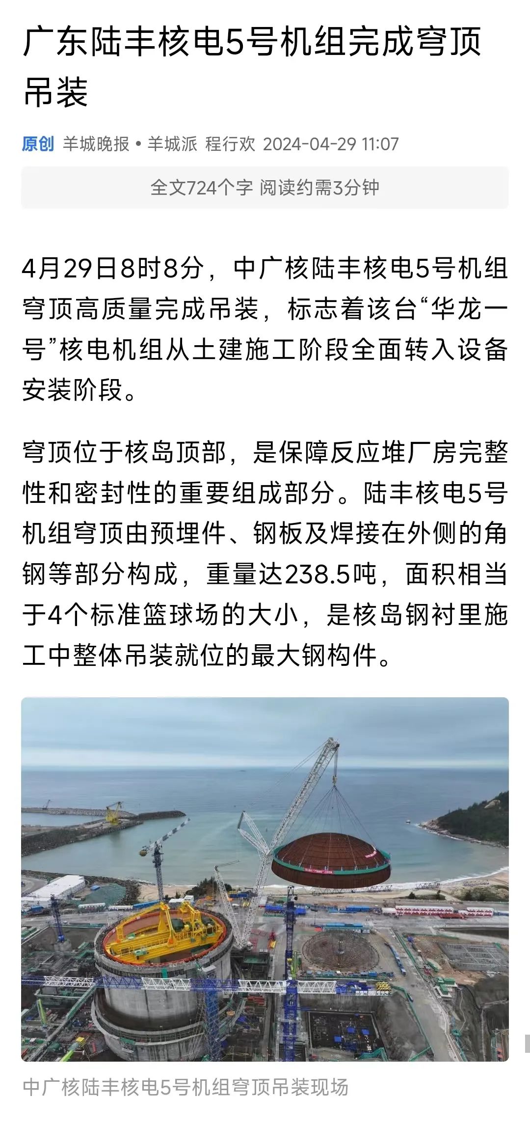4月29日8時8分,中廣核廣東陸豐核電項目5號機組穹頂完成吊裝,標誌著該台“華龍一號”核電機組從土建施工階段全麵轉入設備安裝階段。人民日報、新華社、央視等多家主流媒體對此進行聚焦報道。