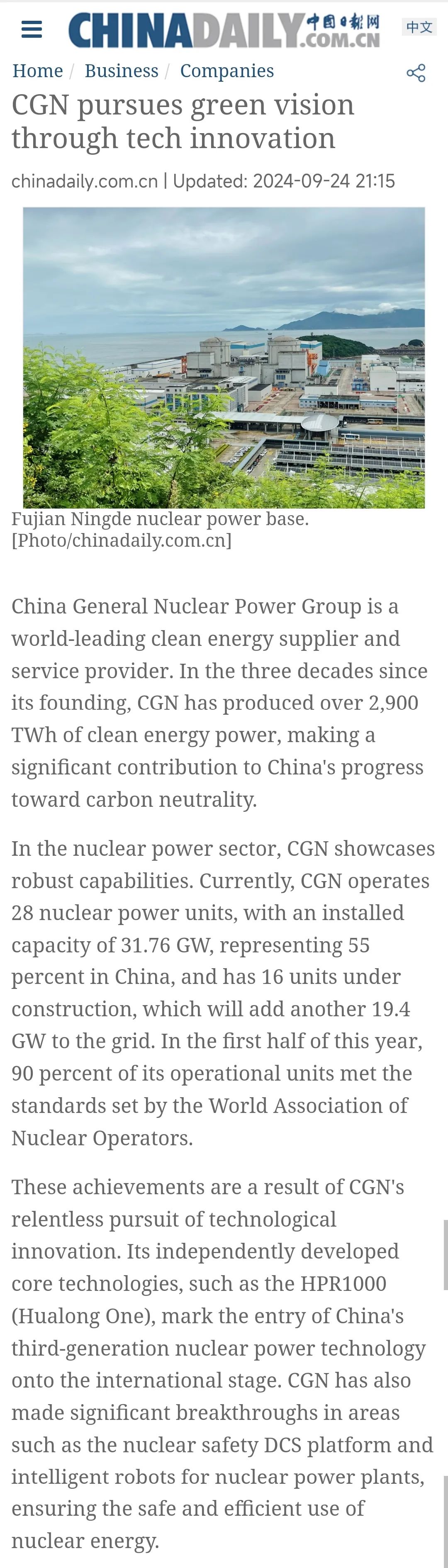 將寧德核電稱讚為“綠色能源與地方共榮的範例”