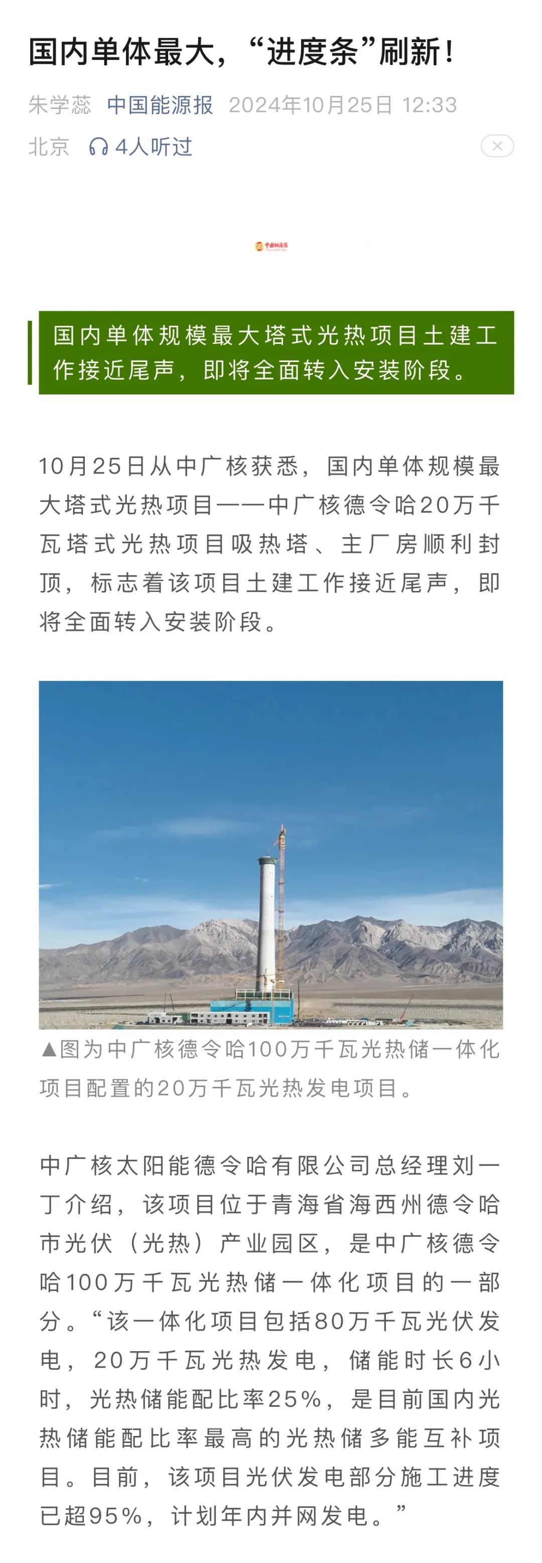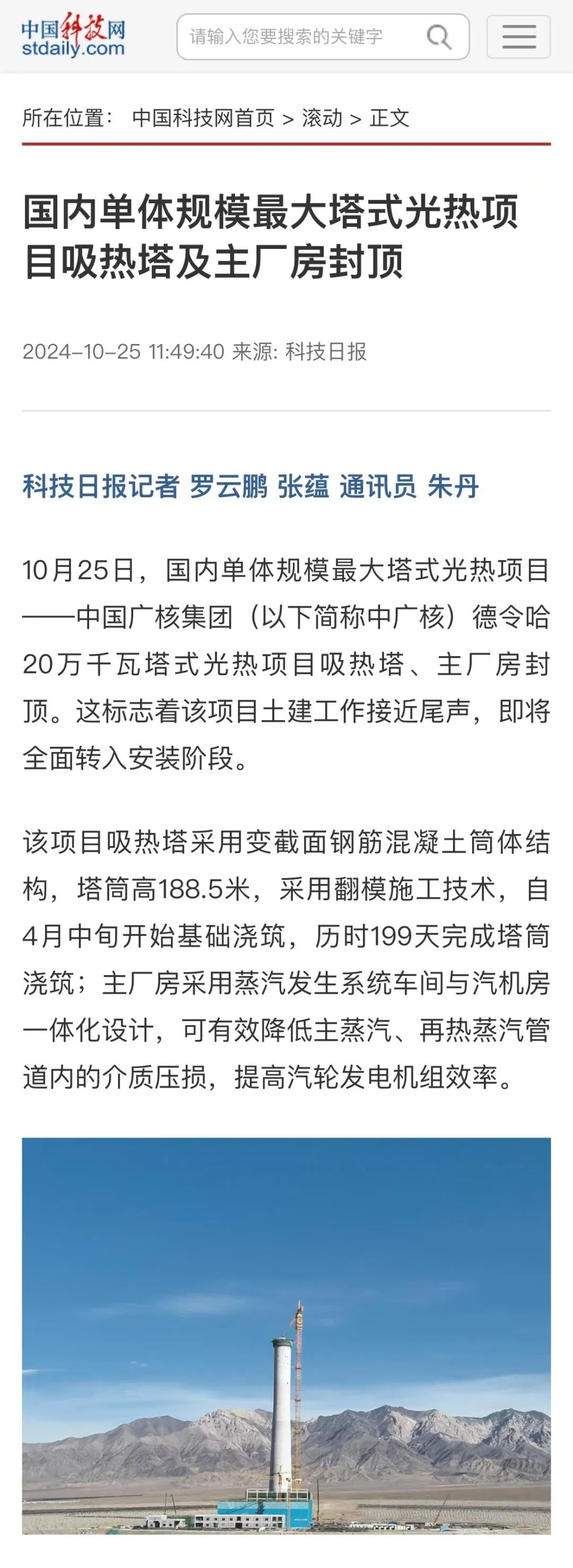 2024年10月25日,國內單體規模最大塔式光熱項目——中廣核德令哈20萬千瓦塔式光熱項目吸熱塔、主廠房順利封頂,標誌著該項目土建工作接近尾聲,即將全麵轉入安裝階段。