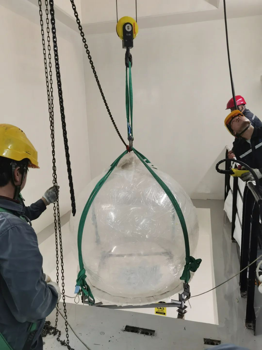 ▲正在引入有機玻璃球,將用於盛裝捕捉中微子用的神秘液體“液閃”