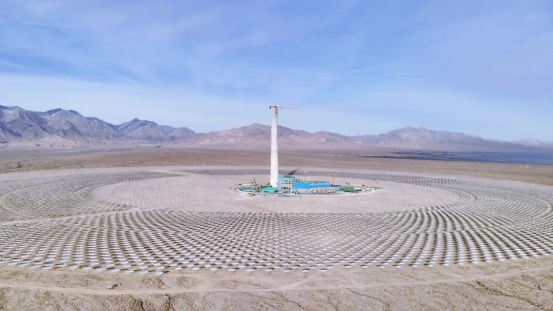 2024年9月5日,20萬千瓦塔式光熱項目吸熱塔澆築高度突破百米。10月25日,吸熱塔、主廠房主體結構封頂,項目土建工作接近尾聲,全麵轉入安裝階段。12月13日,80萬千瓦光伏發電項目成功並網發電。截至目前,光熱部分空壓機房、化水車間、空冷島等輔助廠房主體結構均已完工,熔鹽儲罐安裝完成40%,鏡場定日鏡安裝進度達到65%,一yi排pai排pai定ding日ri鏡jing鱗lin次ci櫛zhi比bi,在zai陽yang光guang的de照zhao射she下xia,閃shan耀yao著zhe奪duo目mu的de光guang芒mang。曾zeng經jing的de不bu毛mao之zhi地di,因yin項xiang目mu的de到dao來lai,為wei當dang地di經jing濟ji社she會hui發fa展zhan注zhu入ru了le新xin的de活huo力li和he希xi望wang。
