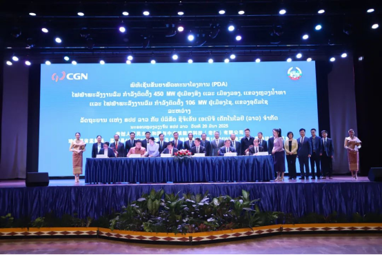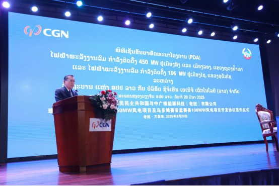 老撾當地時間3月20日,中廣核能源科技(老撾)有限公司與老撾政府在萬象簽署《老撾北部互聯互通清潔能源基地二期556MW風電項目開發協議(PDA)》。老撾人民革命黨中央政治局委員、建國陣線中央委員會主席辛拉馮,老撾能礦部部長坡賽·賽雅頌,中國駐老撾大使館公參王暢等出席簽約活動。
