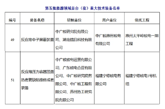 近日,國家能源局發布2025年第4號公告,決定將82項技術裝備列為第五批能源領域首台(套)重大技術裝備,中廣核“反應堆中子屏蔽裝置”“反應堆壓力容器頂蓋熱套管缺陷維修成套裝備”兩項產品獲批列入。