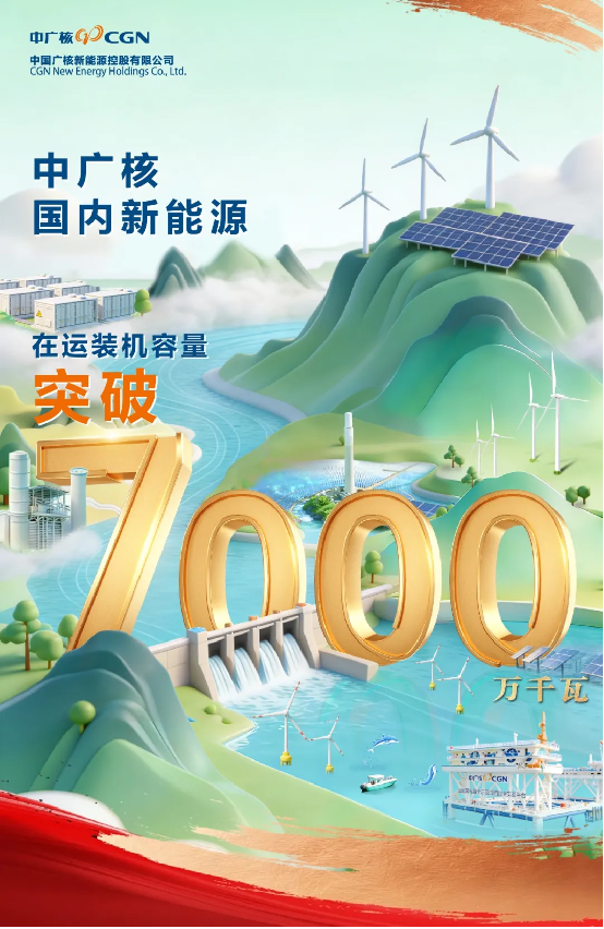 2025年12月31日,中廣核南疆和田策勒光伏治沙項目、北疆塔城額敏風電項目、廣東陽江海上風電項目、新疆吉木乃及廣西玉林地區風電項目群並網發電,中廣核國內新能源在運裝機容量突破7000萬千瓦,標誌著集團新能源“倍增計劃”全麵實現,公司“十四五”規劃目標圓滿完成,為我國能源綠色低碳轉型發展作出了積極貢獻。