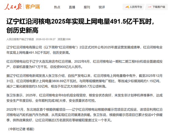 作為我國東北地區第一座核電站、區域最大電力能源基地,紅沿河核電以習近平新時代中國特色社會主義思想為指導,錨定高質量發展目標,深入踐行“綠水青山就是金山銀山”理念,以技術創新激活新質生產力,全年實現上網電量491.5億千瓦時,創曆史新高,6台機組累計實現上網電量3808.69億千瓦時,等效減排二氧化碳約3.52億噸,為東北能源保供、生態保護和遼寧全麵振興、全方位振興,交出了一份“安全穩、創新強、生態優、責任實”的年度答卷。
