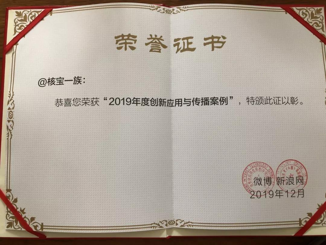 2019年12月30日微博與新浪網主辦的致敬初心·微博十年政務微博之夜於天津舉行中廣核獲“創新應用與傳播案例獎”