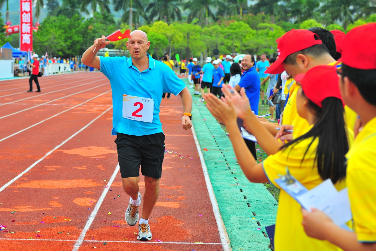 2012.10.29集團第四次運動會上,台山公司法方運動員拿著小國旗跑完最後的賽程...