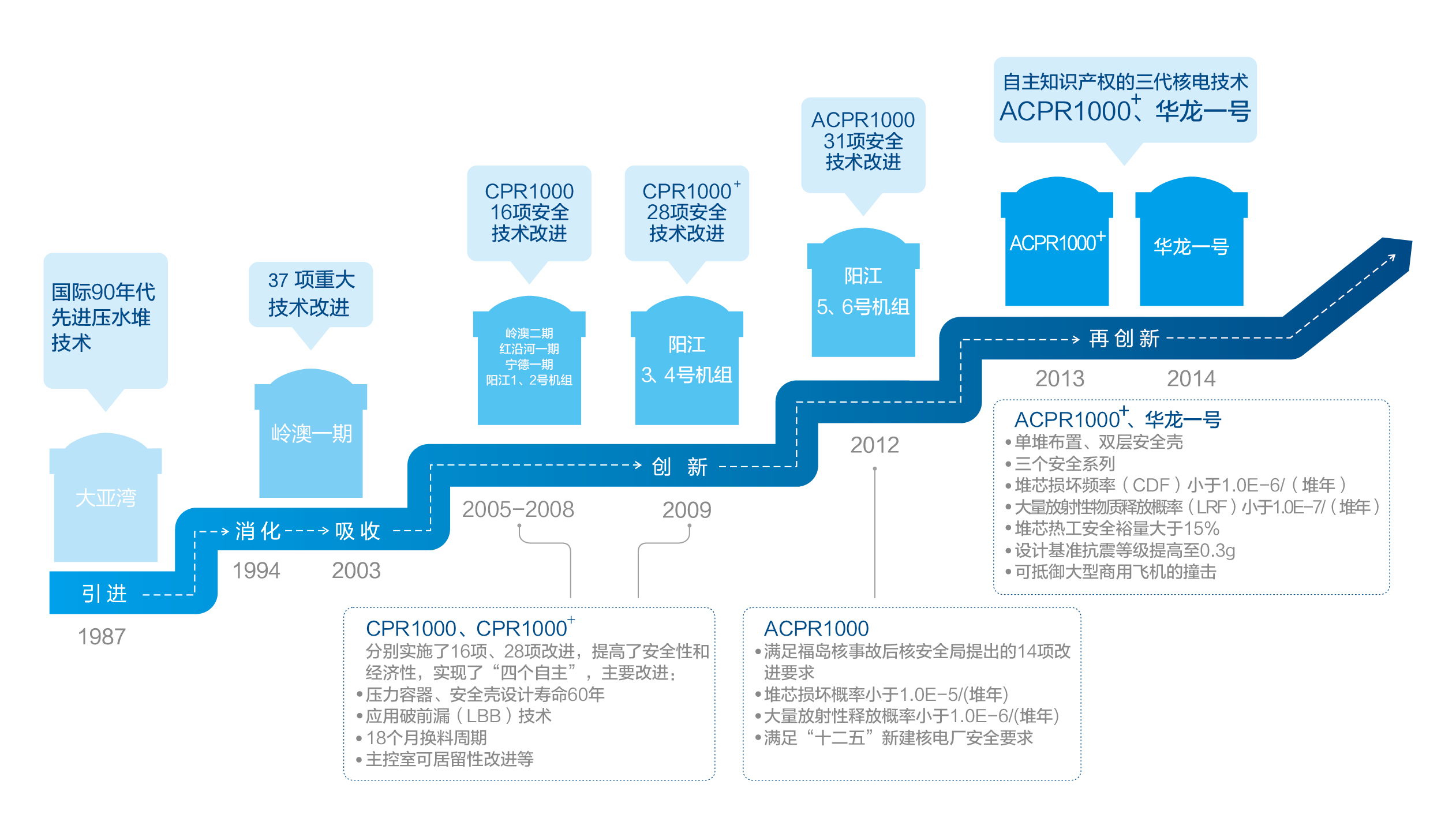 (1)中國自上世紀八十年代引進國外技術,通過消化、吸收和再創新,全麵實現了自主設計、自主製造、自主建設和自主運營,並跨入了"自主 創造 "的新階段,具備了形成自主知識產權三代核電技術的條件。