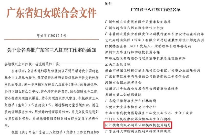 “三八”婦女節前夕,廣東省婦女聯合會下發《關於命名首批廣東省三八紅旗工作室的通知》,陽江核電有限公司趙月領銜建設的工作室被命名為“廣東省三八紅旗工作室”。
