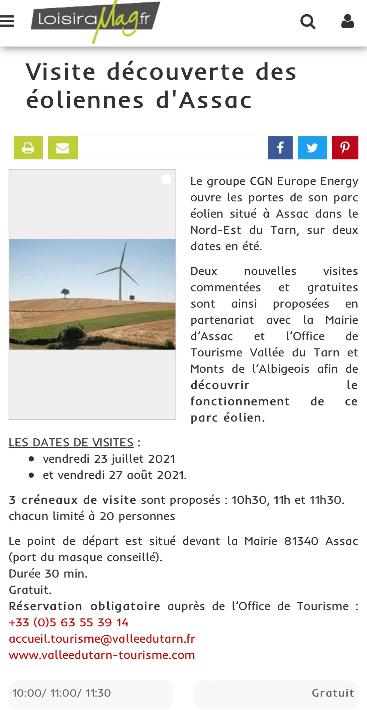 法國旅遊網站Losiramag刊登報道中廣核歐能公司聯合塔恩河穀和阿爾比蓋奧山旅遊局和Assac市政府將在今年夏天開展的“探索風電場”為主題的公益性參觀活動的旅遊信息。