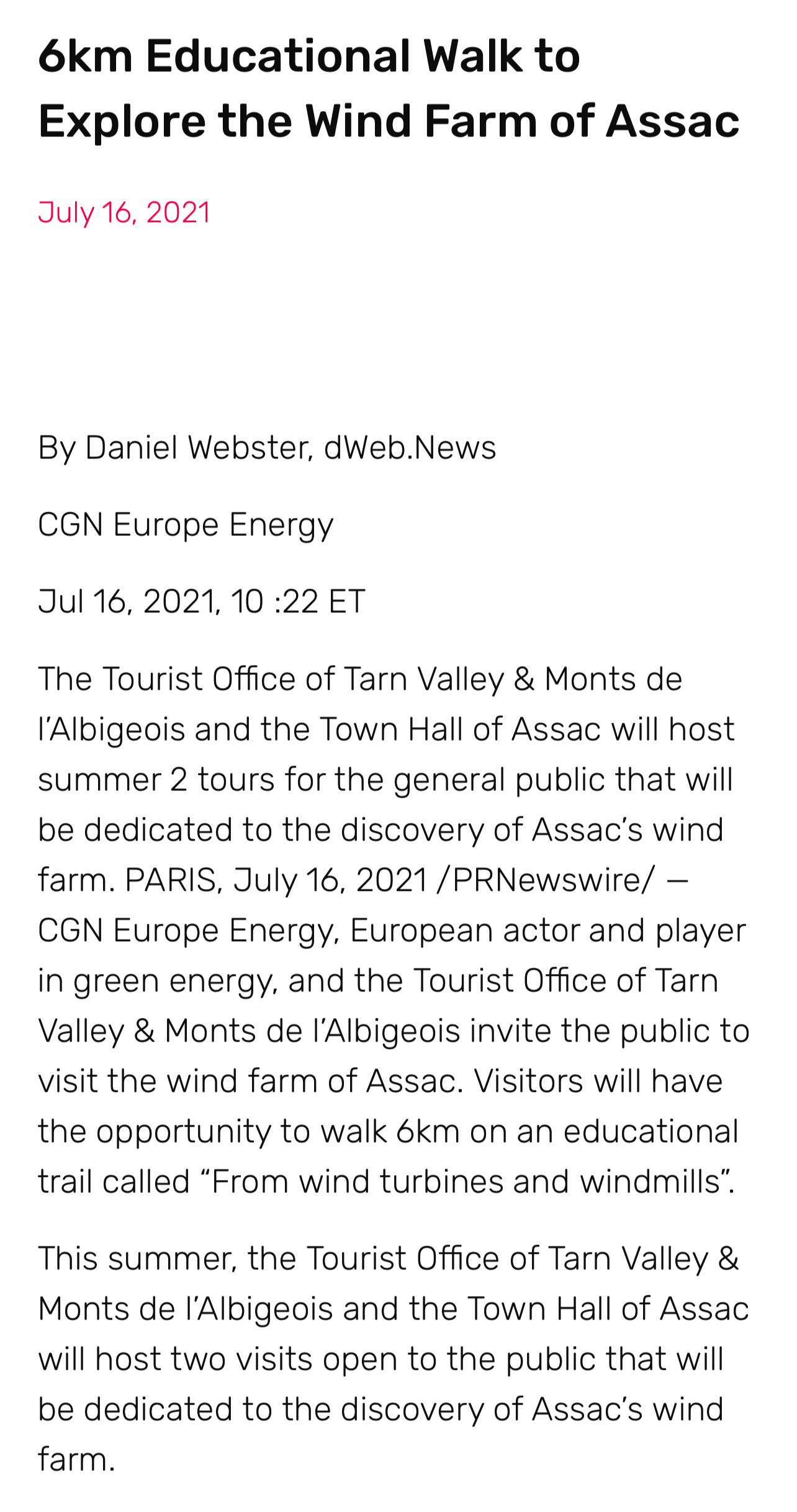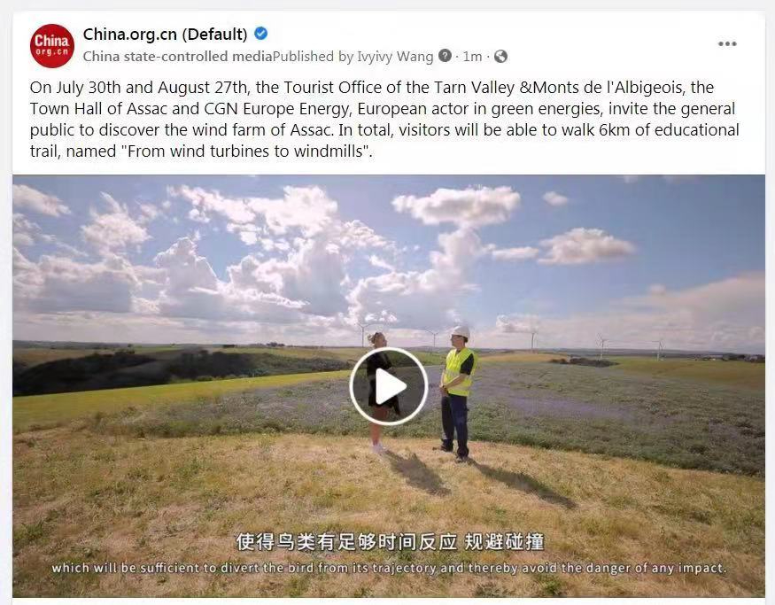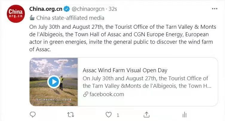 英語行業性媒體《Energy Central News》報道中廣核歐能公司聯合塔恩河穀和阿爾比蓋奧山旅遊局和Assac市政府將在今年夏天開展的“探索風電場”為主題的公益性參觀活動。