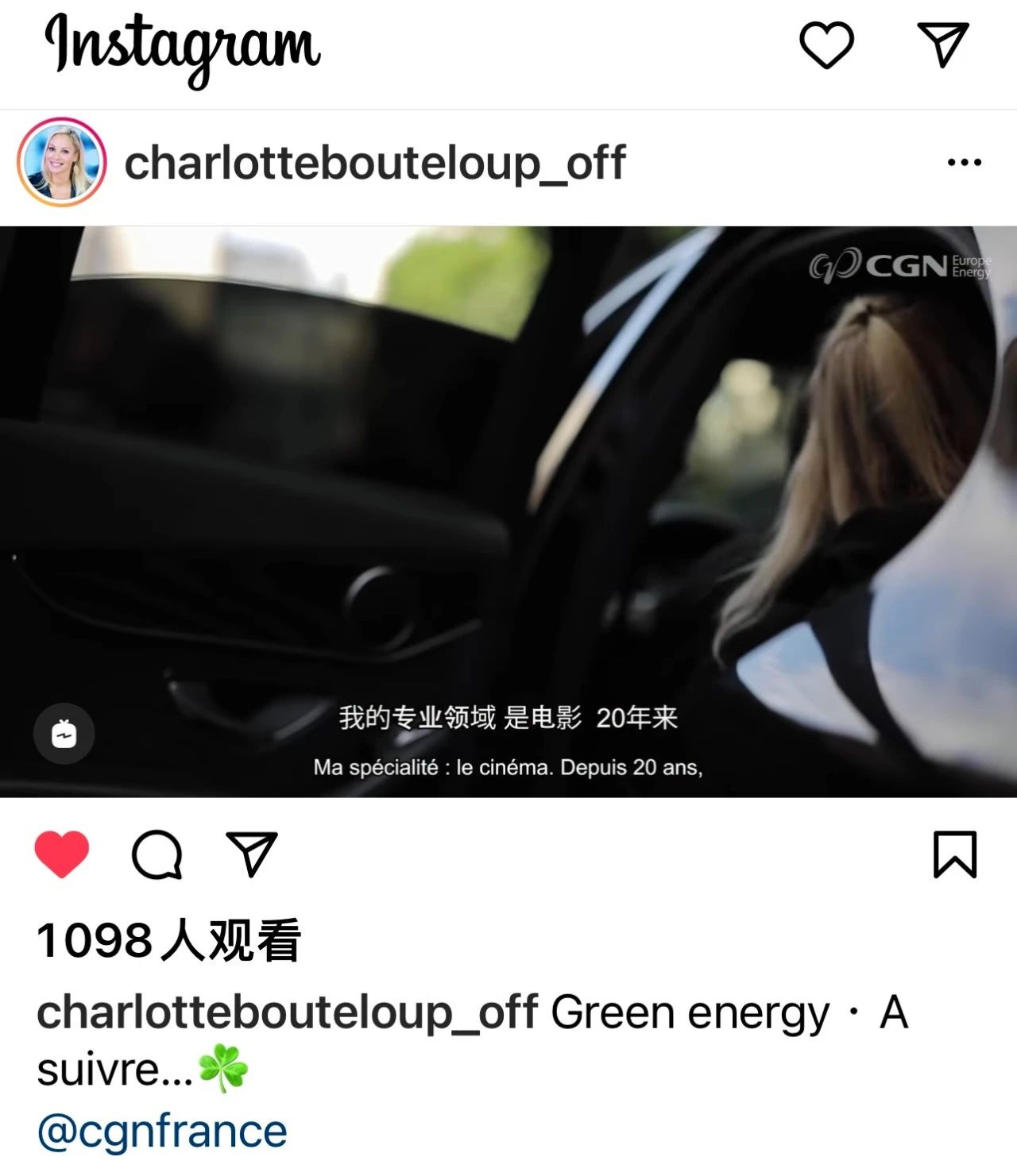 法國電視台知名主持人夏洛特·布特魯普(Charlotte Bouteloup)與中國廣核集團的海外社交媒體賬號聯動,在其個人Instagram和Facebook上發布活動視頻,作為總粉絲量10萬+的大V,其Ins賬戶發布一小時內觀看人數上千。