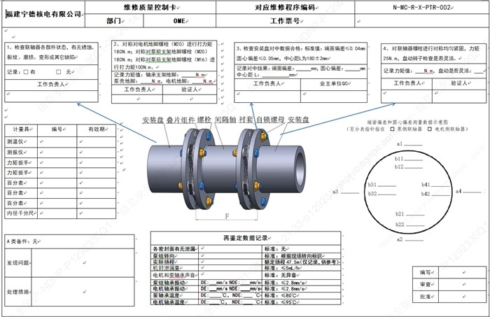 寧德核電開展維修質量控製卡編製工作,在“標準不打折、質量不下降、環節不缺失”的基礎上,減輕工作負責人執行維修程序的負擔,提升效率的同時實現質量關鍵點“可視化”。曆時兩個月反複論證,完成首份維修質量控製卡,將乏燃料水池冷卻泵聯軸器對中檢查工作多達9頁的維修程序文件精簡為一張圖表,清晰簡潔地展示設備結構、質量標準、操作要求等。目前,現場已完成244份維修質量控製卡的使用,相關檢修工作均達標準要求,並獲得工作負責人的認可。