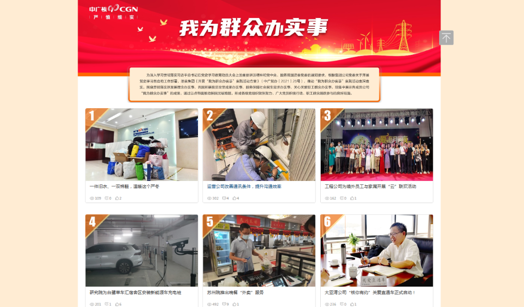 開設“我為群眾辦實事”專題網頁,曬辦實事成果。中廣核推出專題網頁,集中展示各單位“我為群眾辦實事”代表性成果,每月對成果進行滾動更新。通過各單位曬成果,接受群眾監督、開展群眾評價,形成各級黨組織聚焦聚力、廣大黨員積極行動、員工群眾踴躍參與的良好局麵。
