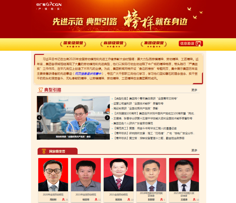 搭建“身邊的榜樣”專題網頁,傳播先進典型事跡。中廣核策劃推出“身邊的榜樣”專題網頁,按照國家級、省部級、集團級分類梳理建立個人榮譽檔案,集中展示先進典型的主要榮譽、工作經曆、曆年獲獎情況、先進事跡、主要貢獻及相關事跡報道,以身邊榜樣的優秀事跡,展現中廣核人的優良傳統,彰顯中廣核人的精神底色。