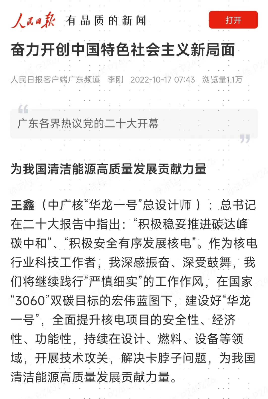 習近平總書記的報告氣勢恢宏、催cui人ren奮fen進jin,充chong分fen體ti現xian百bai年nian大da黨dang的de曆li史shi主zhu動dong精jing神shen和he責ze任ren擔dan當dang,是shi新xin時shi代dai指zhi引yin全quan黨dang在zai全quan麵mian建jian設she社she會hui主zhu義yi現xian代dai化hua國guo家jia新xin征zheng程cheng上shang接jie續xu奮fen鬥dou的de綱gang領ling性xing文wen件jian。作zuo為wei核he能neng事shi業ye工gong作zuo者zhe,我wo們men一yi定ding認ren真zhen學xue習xi貫guan徹che落luo實shi好hao黨dang的de二er十shi大da精jing神shen,胸xiong懷huai“國之大者”,做到“兩個維護”,深入踐行“嚴慎細實”工(gong)作(zuo)作(zuo)風(feng),牢(lao)牢(lao)守(shou)住(zhu)核(he)安(an)全(quan)底(di)線(xian),不(bu)負(fu)時(shi)代(dai)召(zhao)喚(huan)和(he)使(shi)命(ming)擔(dan)當(dang),奮(fen)力(li)開(kai)拓(tuo)中(zhong)廣(guang)核(he)核(he)能(neng)事(shi)業(ye)高(gao)質(zhi)量(liang)發(fa)展(zhan)的(de)新(xin)局(ju)麵(mian),為(wei)全(quan)麵(mian)建(jian)設(she)社(she)會(hui)主(zhu)義(yi)現(xian)代(dai)化(hua)國(guo)家(jia)作(zuo)出(chu)新(xin)貢(gong)獻(xian)!