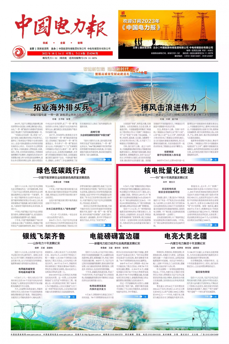 10月20日,人民日報以《走清潔能源發展之路》為題,聚焦報道中廣核堅持科技引領、推動綠色發展所取得的一係列成績。經濟日報、中國電力報等媒體聚焦報道中廣核近十年來在科技創新、核電批量化建設等方麵的發展成果。