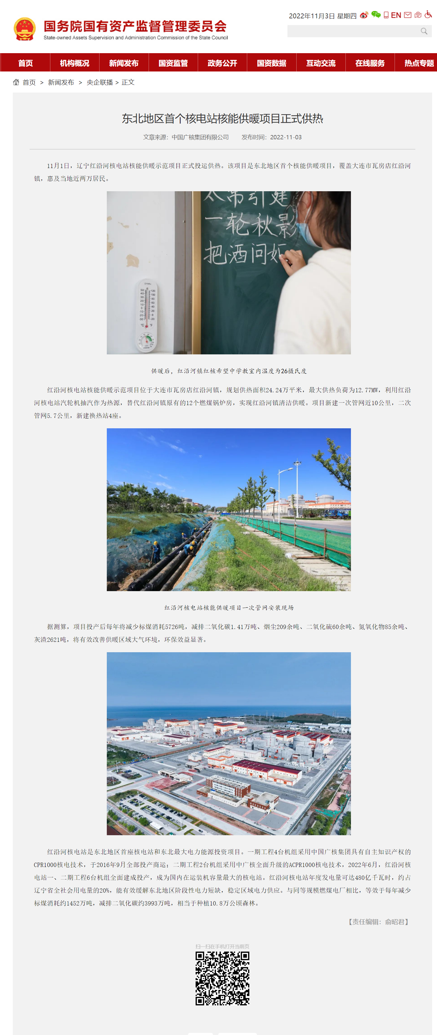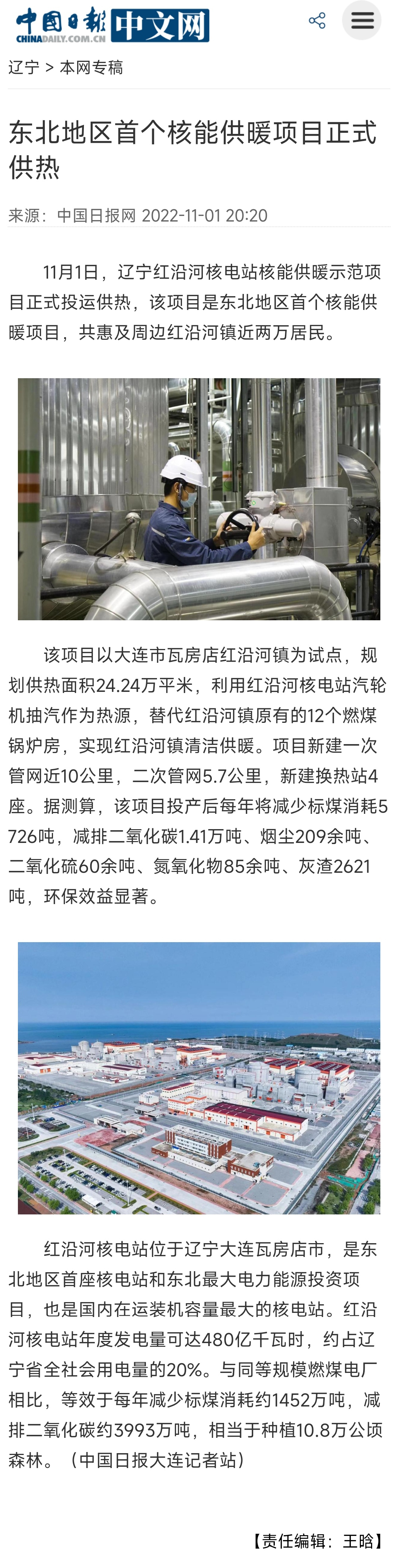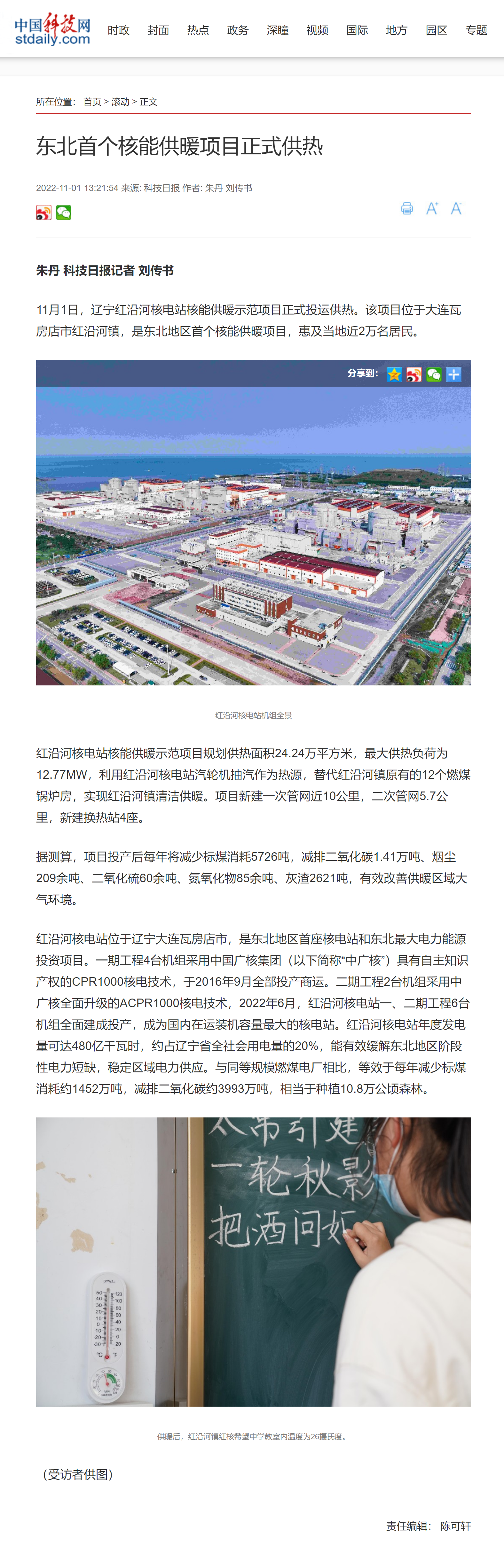 11月1日(ri),遼(liao)寧(ning)紅(hong)沿(yan)河(he)核(he)電(dian)站(zhan)核(he)能(neng)供(gong)暖(nuan)示(shi)範(fan)項(xiang)目(mu)正(zheng)式(shi)投(tou)運(yun)供(gong)熱(re),該(gai)項(xiang)目(mu)是(shi)東(dong)北(bei)地(di)區(qu)首(shou)個(ge)核(he)能(neng)供(gong)暖(nuan)項(xiang)目(mu),覆(fu)蓋(gai)大(da)連(lian)市(shi)瓦(wa)房(fang)店(dian)紅(hong)沿(yan)河(he)鎮(zhen),惠(hui)及(ji)當(dang)地(di)近(jin)兩(liang)萬(wan)居(ju)民(min)。