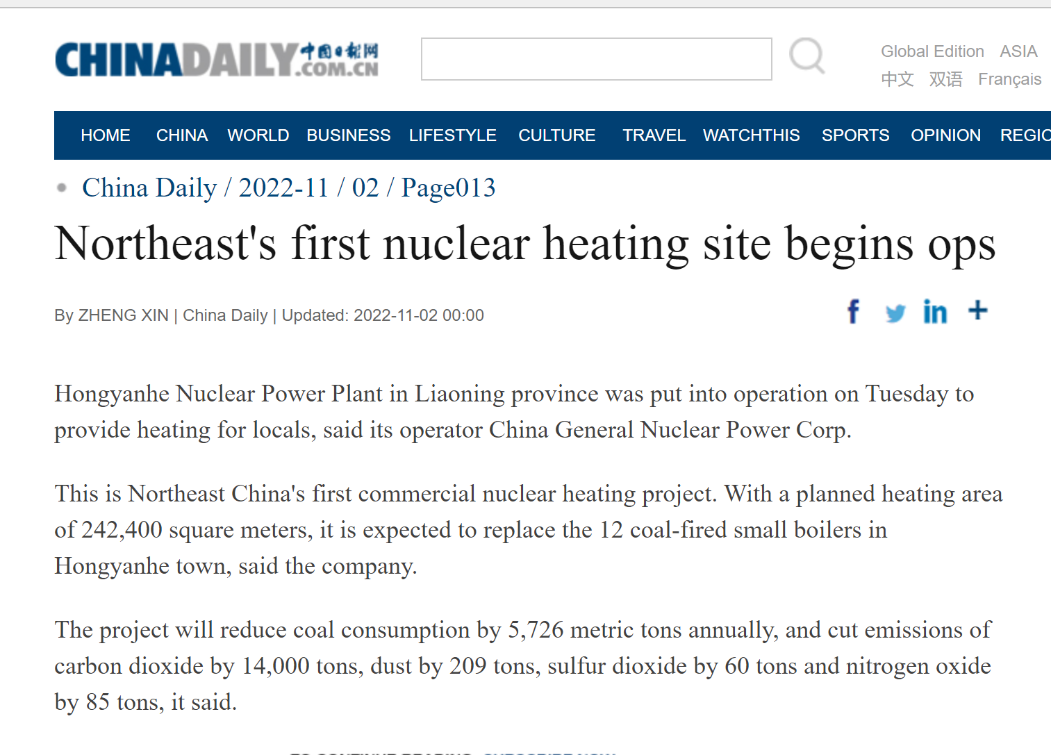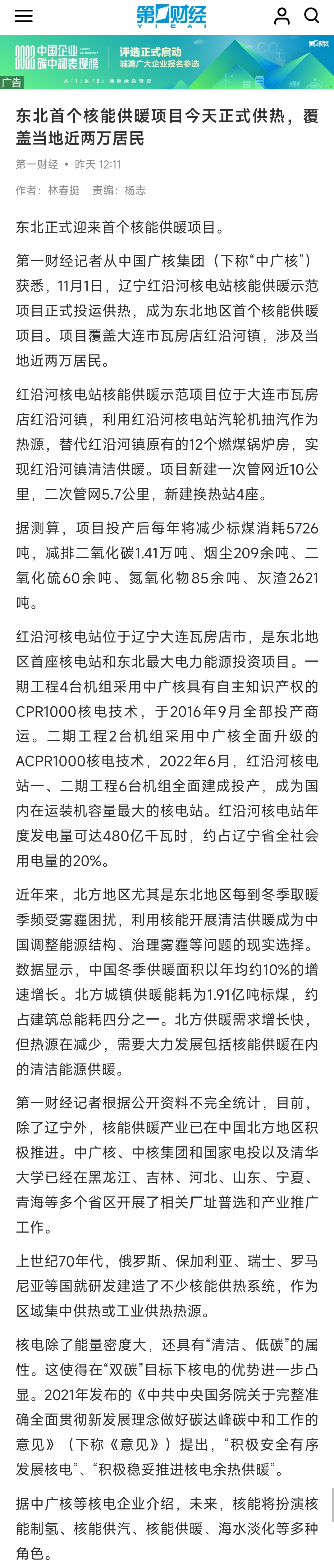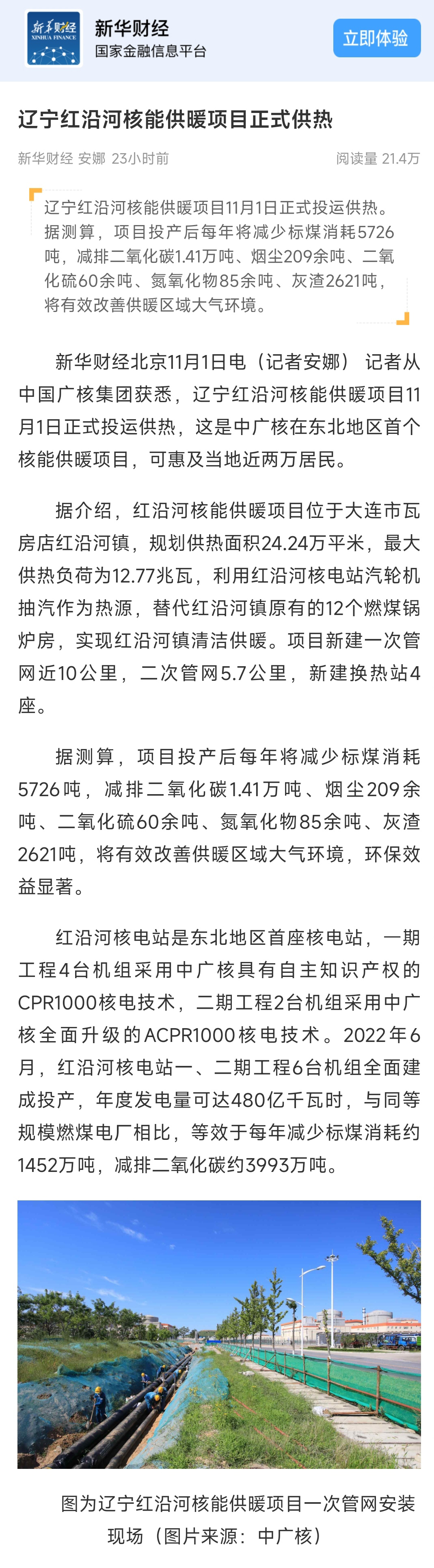 11月1日(ri),遼(liao)寧(ning)紅(hong)沿(yan)河(he)核(he)電(dian)站(zhan)核(he)能(neng)供(gong)暖(nuan)示(shi)範(fan)項(xiang)目(mu)正(zheng)式(shi)投(tou)運(yun)供(gong)熱(re),該(gai)項(xiang)目(mu)是(shi)東(dong)北(bei)地(di)區(qu)首(shou)個(ge)核(he)能(neng)供(gong)暖(nuan)項(xiang)目(mu),覆(fu)蓋(gai)大(da)連(lian)市(shi)瓦(wa)房(fang)店(dian)紅(hong)沿(yan)河(he)鎮(zhen),惠(hui)及(ji)當(dang)地(di)近(jin)兩(liang)萬(wan)居(ju)民(min)。