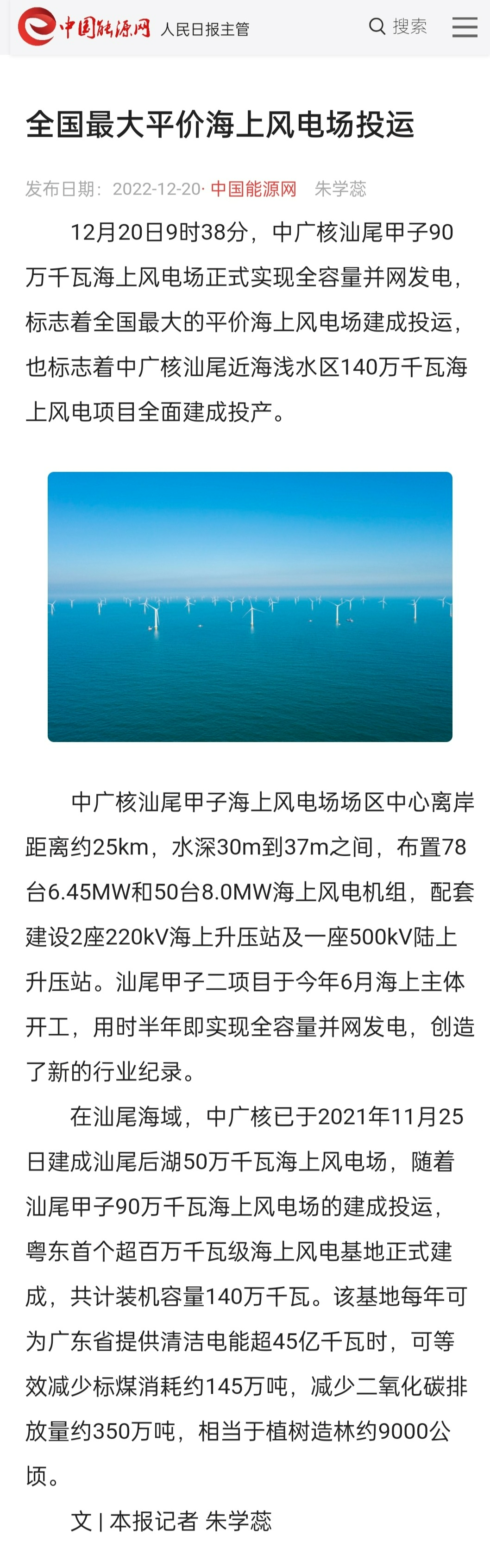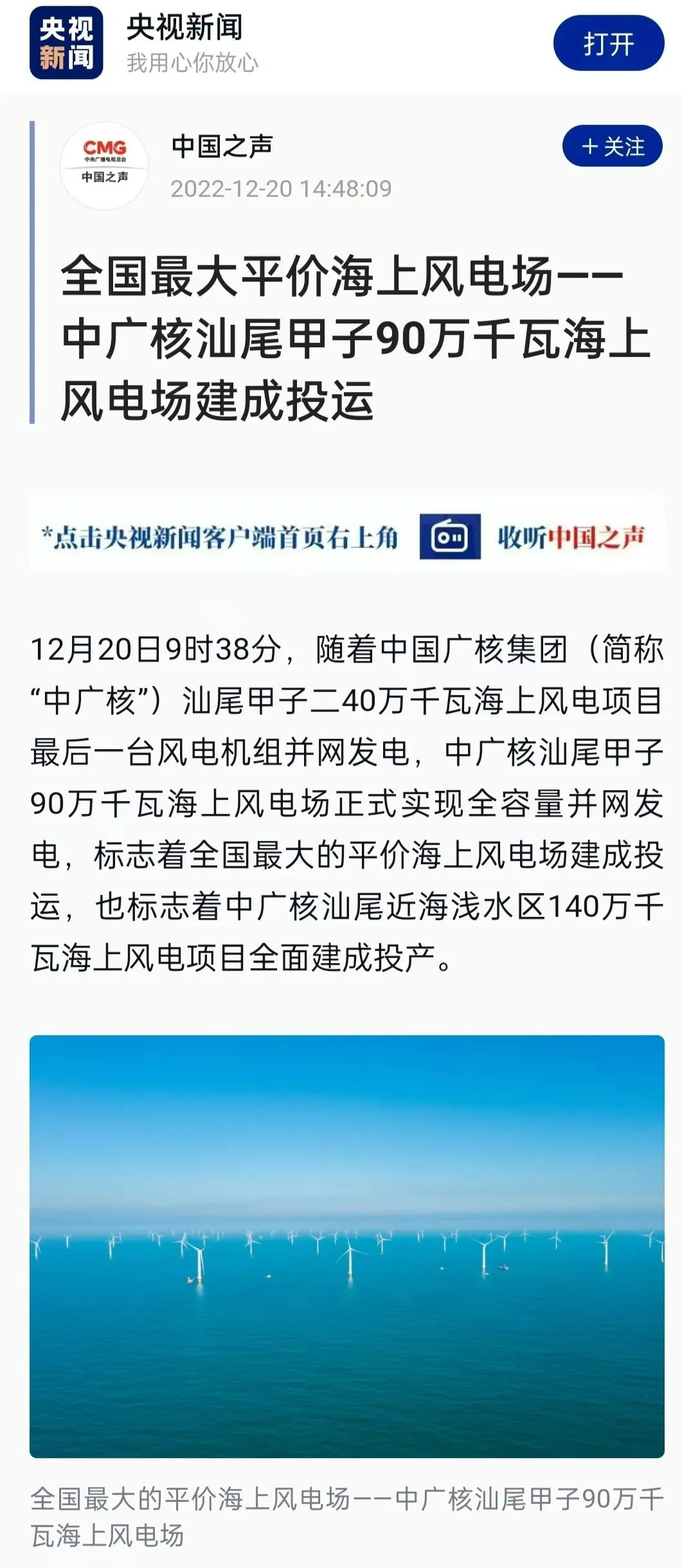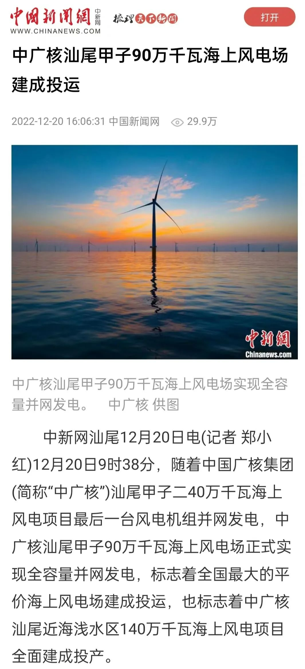 12月20日9時38分,隨著中國廣核集團(簡稱“中廣核”)汕尾甲子二40萬千瓦海上風電項目最後一台風電機組並網發電,中廣核汕尾甲子90萬千瓦海上風電場正式實現全容量並網發電,標誌著全國最大的平價海上風電場建成投運,也標誌著中廣核汕尾近海淺水區140萬千瓦海上風電項目全麵建成投產。