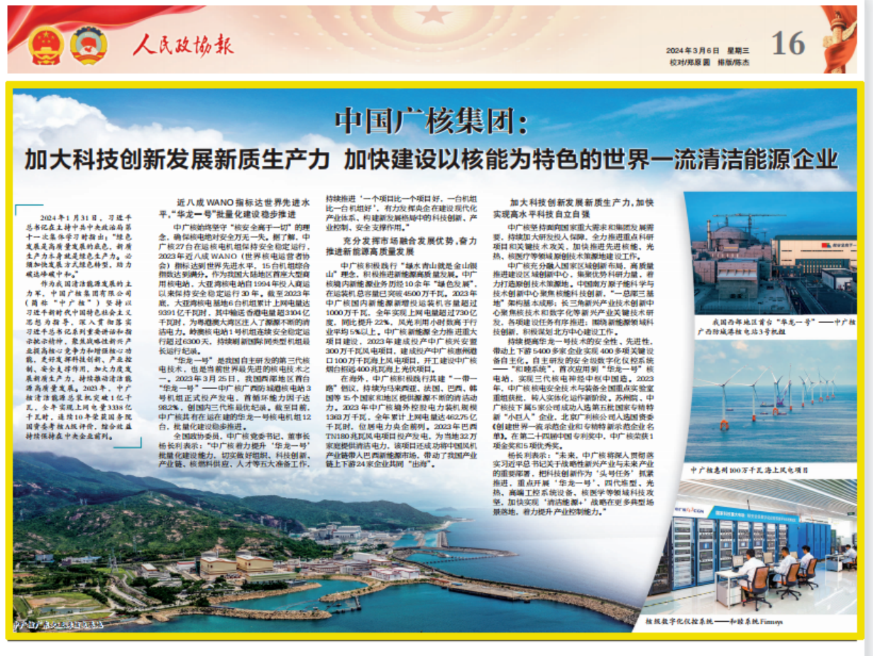 《中國廣核集團:加大科技創新發展新質生產力加快建設以核能為特色的世界一流清潔能源企業》