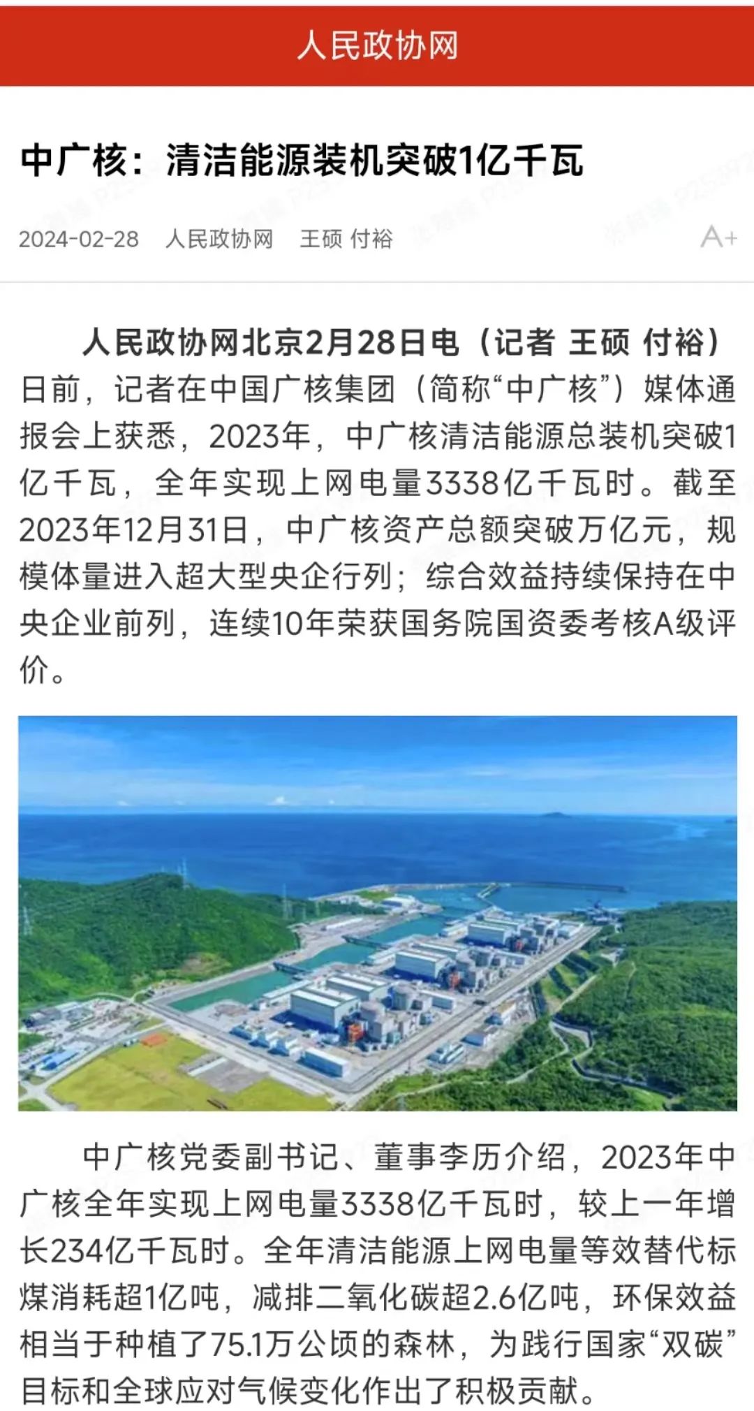 人民政協網北京2月28日電(記者 王碩 付裕)日前,記者在中國廣核集團(簡稱“中廣核”)媒體通報會上獲悉,2023年,中廣核清潔能源總裝機突破1億千瓦,全年實現上網電量3338億千瓦時。截至2023年12月31日,中廣核資產總額突破萬億元,規模體量進入超大型央企行列;綜合效益持續保持在中央企業前列,連續10年榮獲國務院國資委考核A級評價。