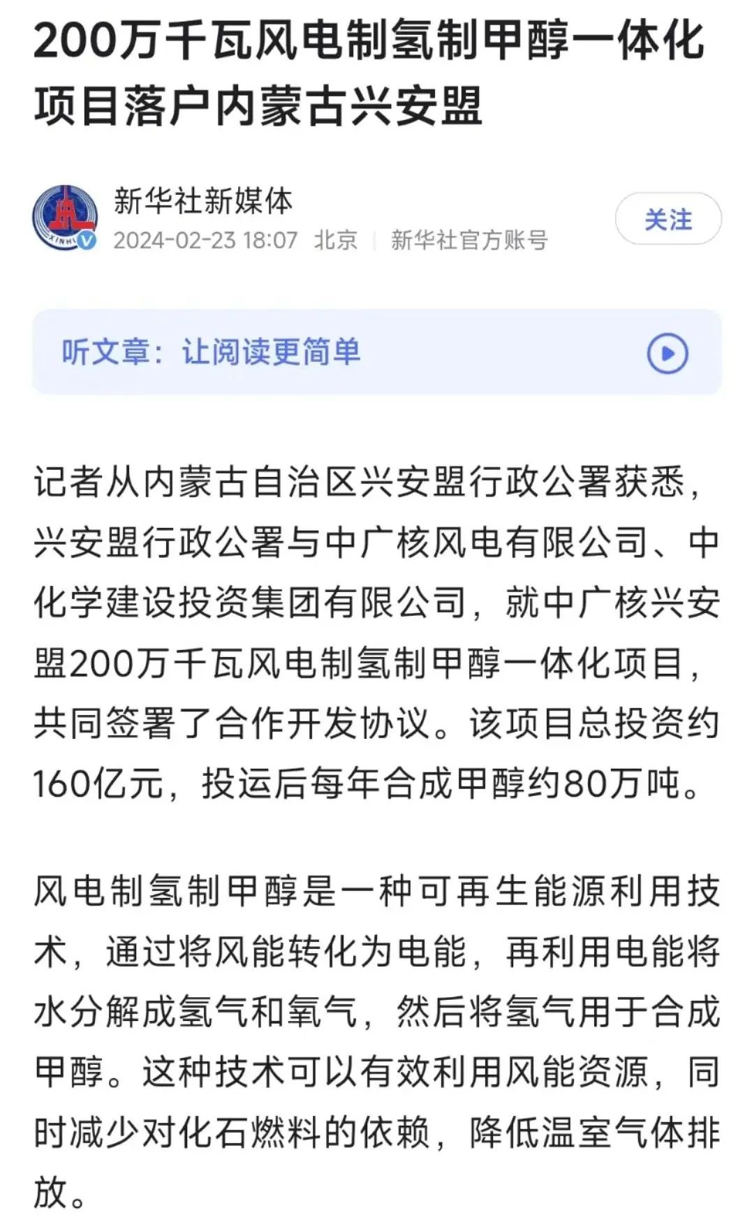 風(feng)電(dian)製(zhi)氫(qing)製(zhi)甲(jia)醇(chun)是(shi)一(yi)種(zhong)可(ke)再(zai)生(sheng)能(neng)源(yuan)利(li)用(yong)技(ji)術(shu),通(tong)過(guo)將(jiang)風(feng)能(neng)轉(zhuan)化(hua)為(wei)電(dian)能(neng),再(zai)利(li)用(yong)電(dian)能(neng)將(jiang)水(shui)分(fen)解(jie)成(cheng)氫(qing)氣(qi)和(he)氧(yang)氣(qi),然(ran)後(hou)將(jiang)氫(qing)氣(qi)用(yong)於(yu)合(he)成(cheng)甲(jia)醇(chun)。這(zhe)種(zhong)技(ji)術(shu)可(ke)以(yi)有(you)效(xiao)利(li)用(yong)風(feng)能(neng)資(zi)源(yuan),同(tong)時(shi)減(jian)少(shao)對(dui)化(hua)石(shi)燃(ran)料(liao)的(de)依(yi)賴(lai),降(jiang)低(di)溫(wen)室(shi)氣(qi)體(ti)排(pai)放(fang)。該(gai)項(xiang)目(mu)總(zong)投(tou)資(zi)約(yue)160億元,投運後每年合成甲醇約80萬噸。