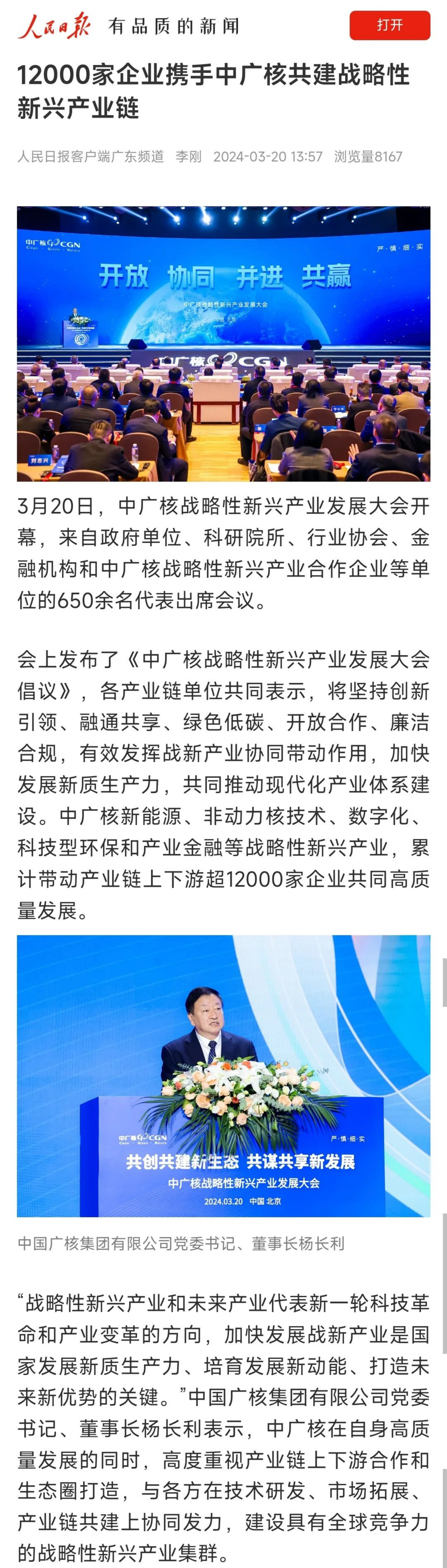 中廣核新能源、非動力核技術、數字化、科技型環保和產業金融等戰略性新興產業,已累計帶動產業鏈上下遊超12000家企業共同高質量發展。人民日報、新華社等主流媒體聚焦報道。