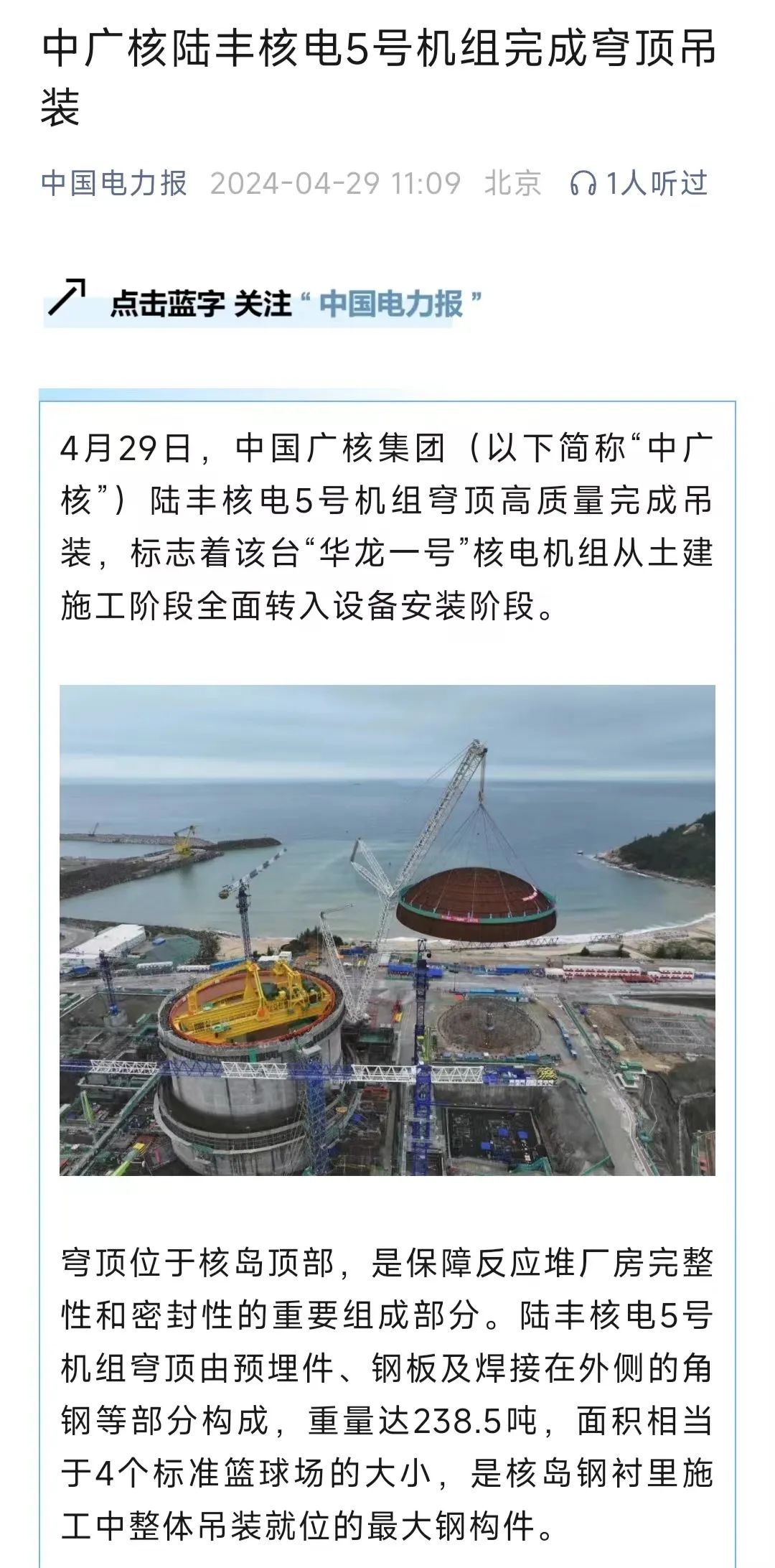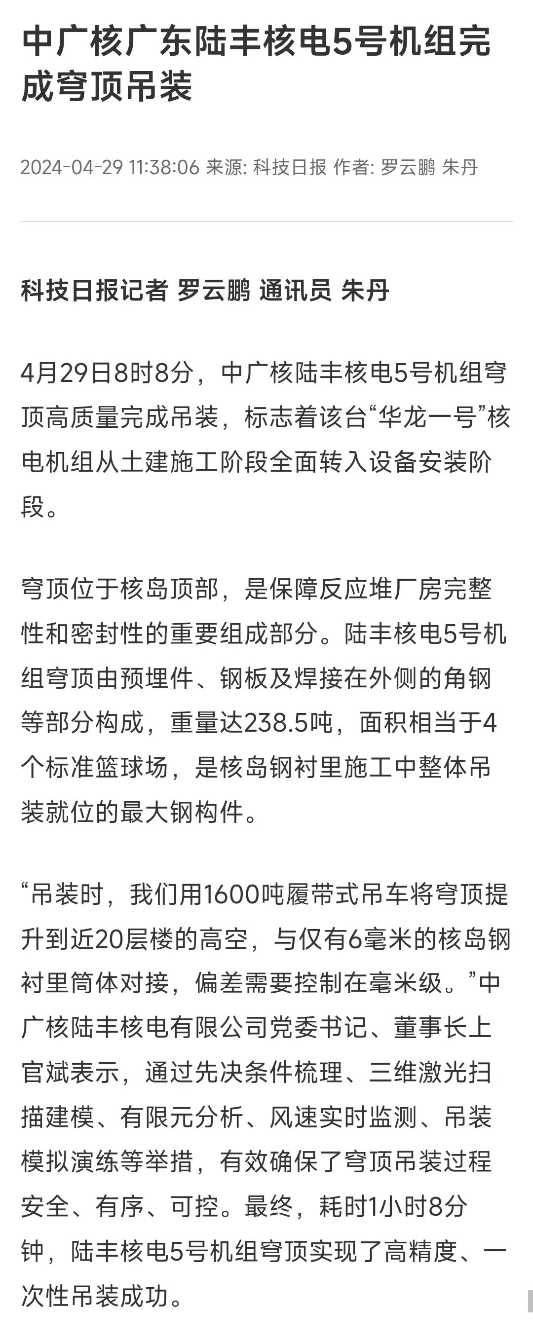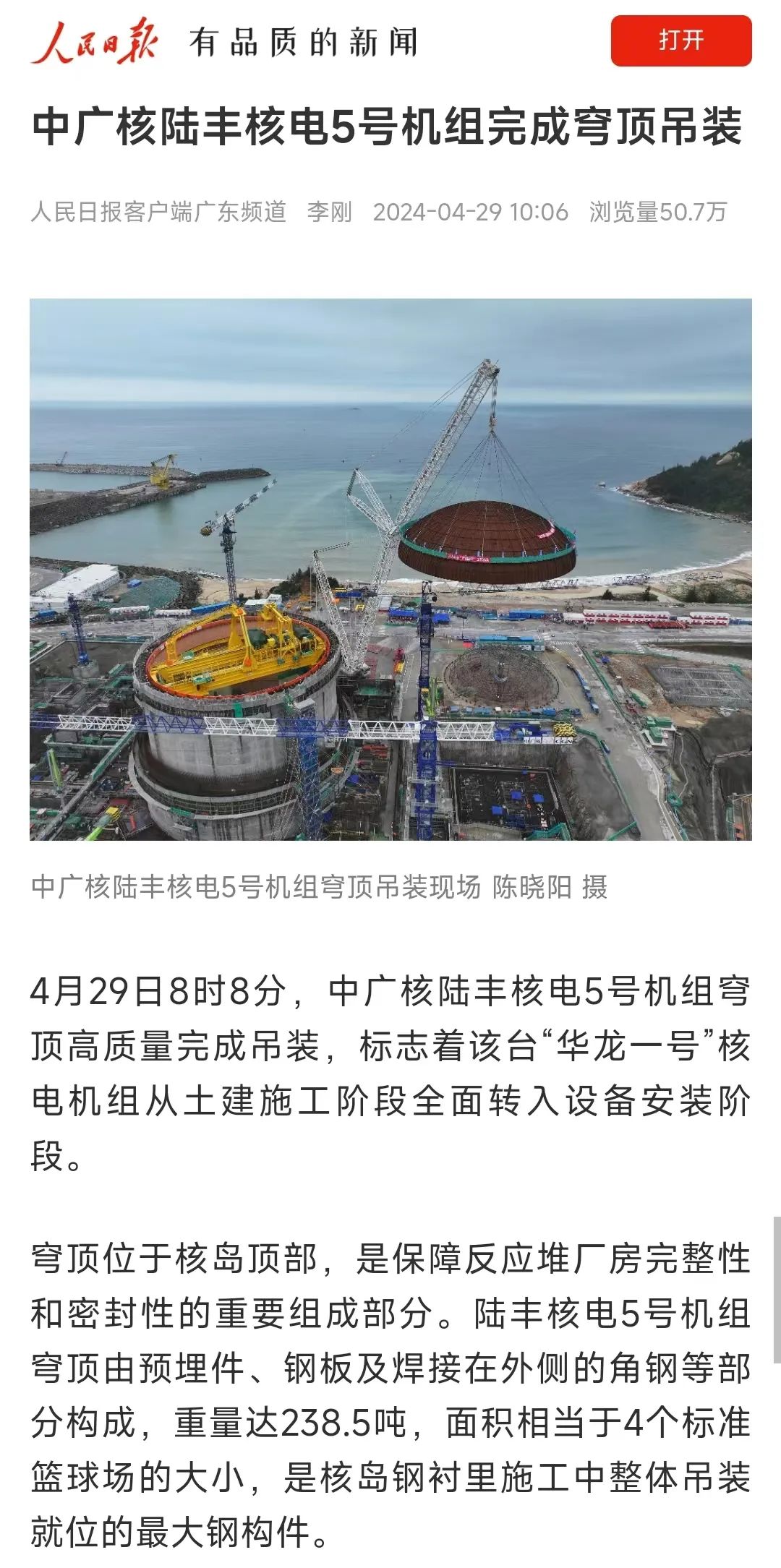 4月29日8時8分,中廣核廣東陸豐核電項目5號機組穹頂完成吊裝,標誌著該台“華龍一號”核電機組從土建施工階段全麵轉入設備安裝階段。人民日報、新華社、央視等多家主流媒體對此進行聚焦報道。