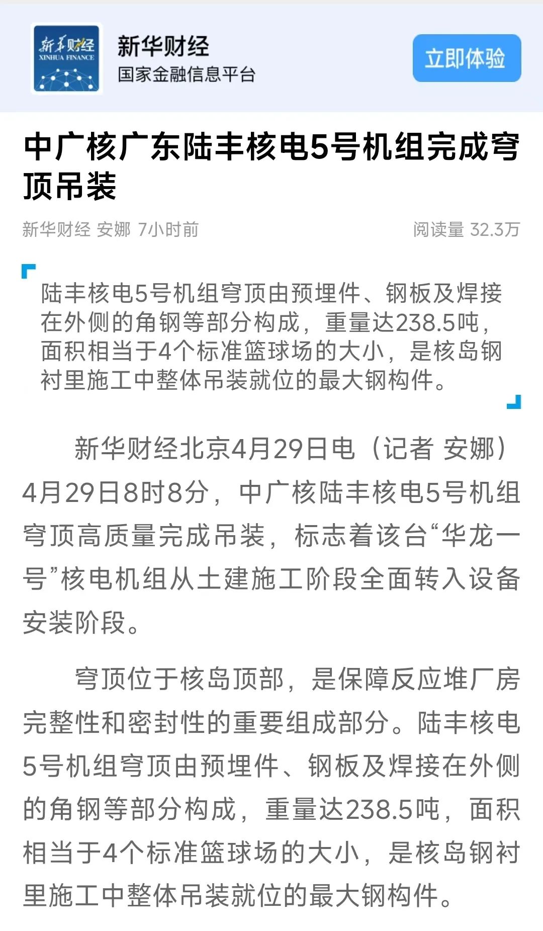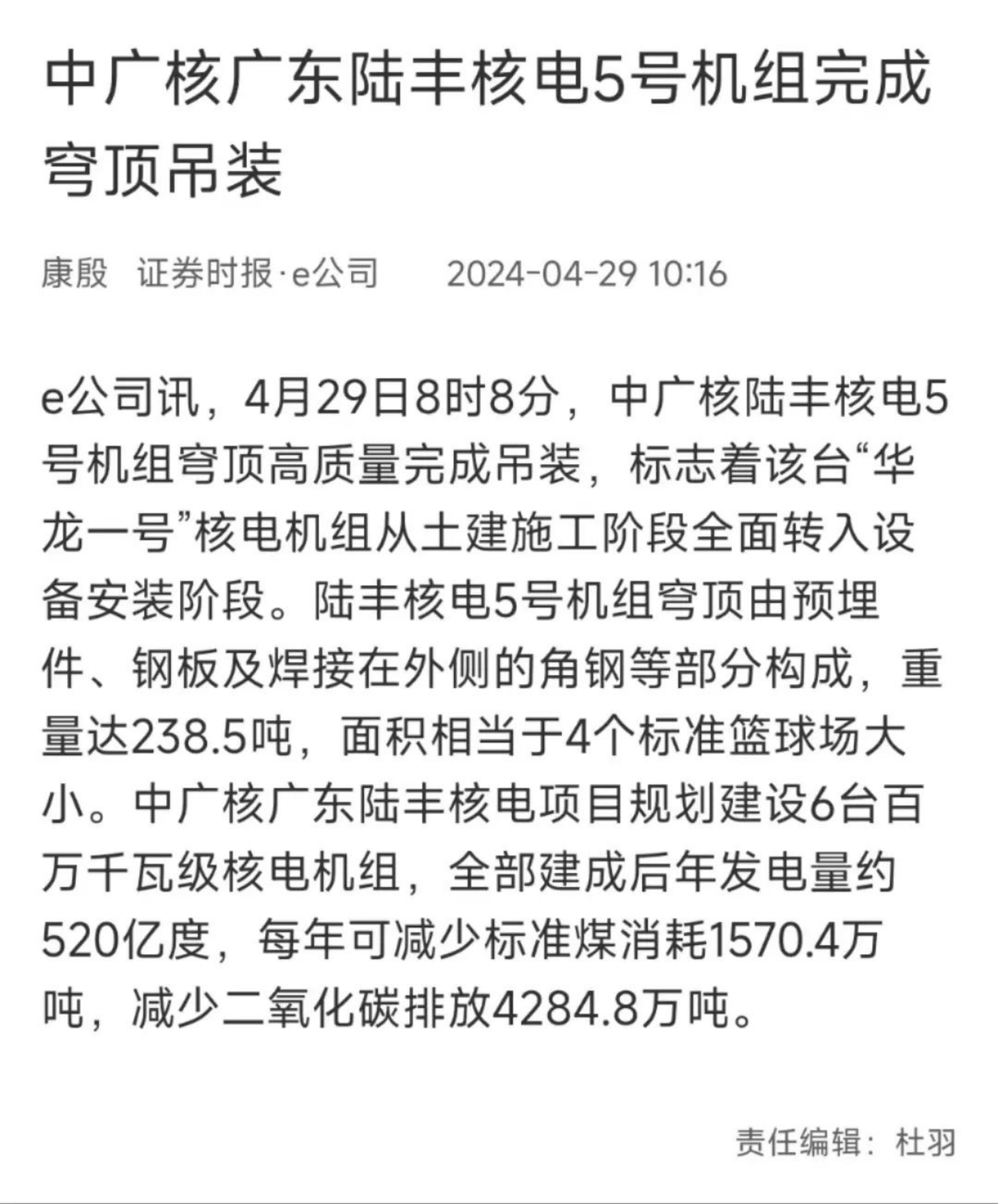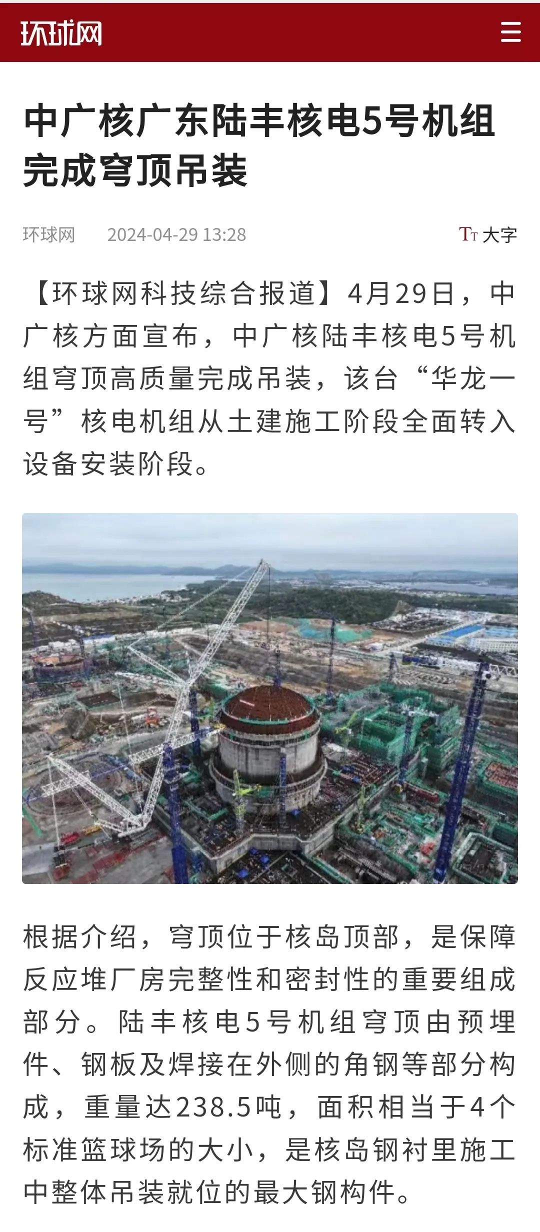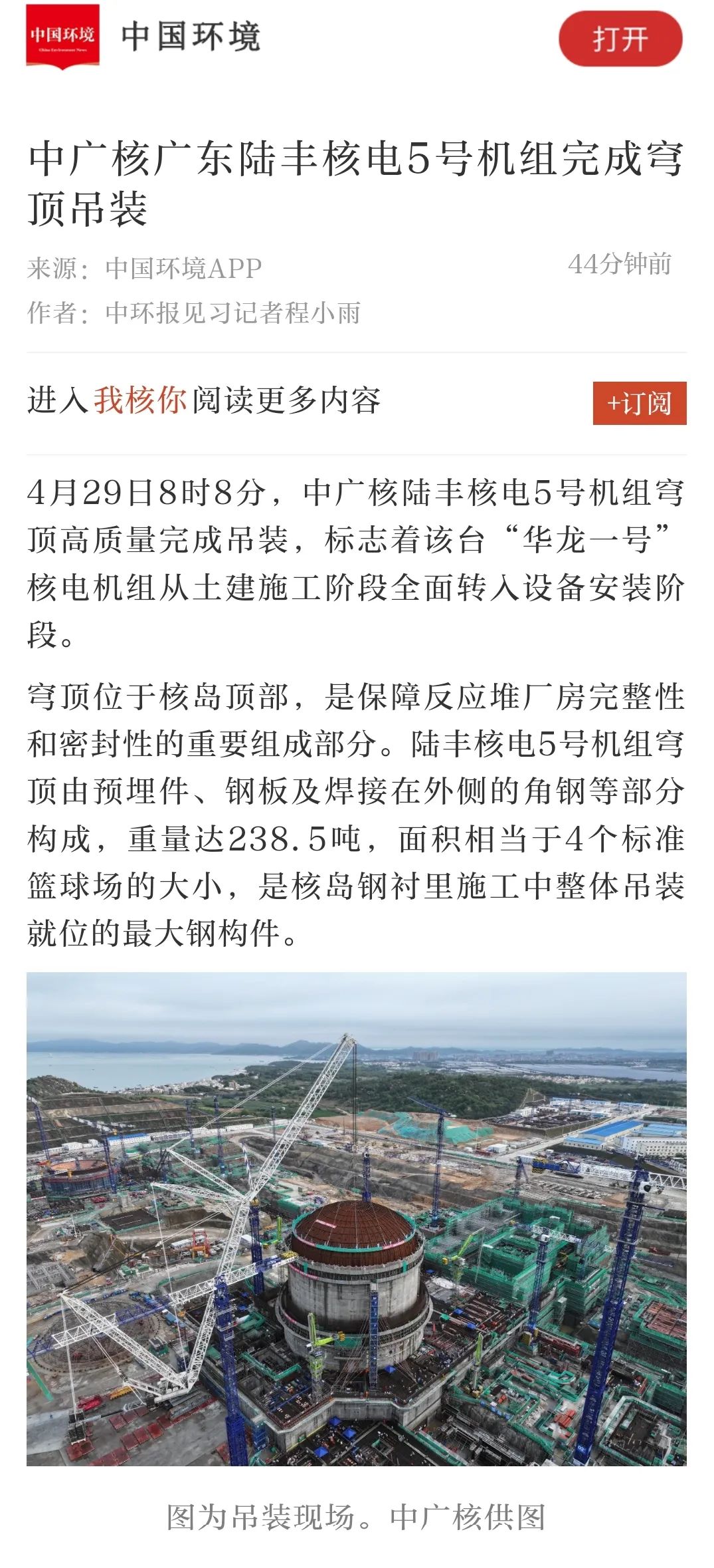 4月29日8時8分,中廣核廣東陸豐核電項目5號機組穹頂完成吊裝,標誌著該台“華龍一號”核電機組從土建施工階段全麵轉入設備安裝階段。人民日報、新華社、央視等多家主流媒體對此進行聚焦報道。