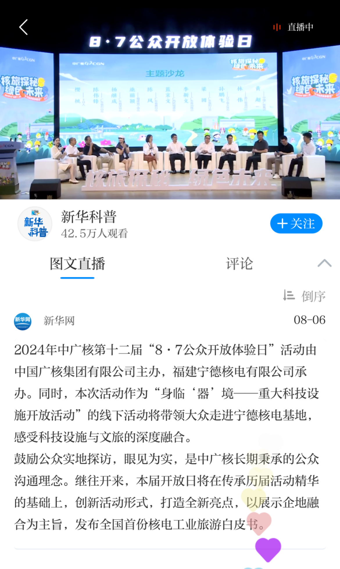 新華網、科技工作者之家、中國科技誌願服務、新浪廣東、核電那些事,以及中廣核官方微博、抖音、視頻號等多個平台,對活動情況進行現場直播,超135萬人次在線觀看互動。
