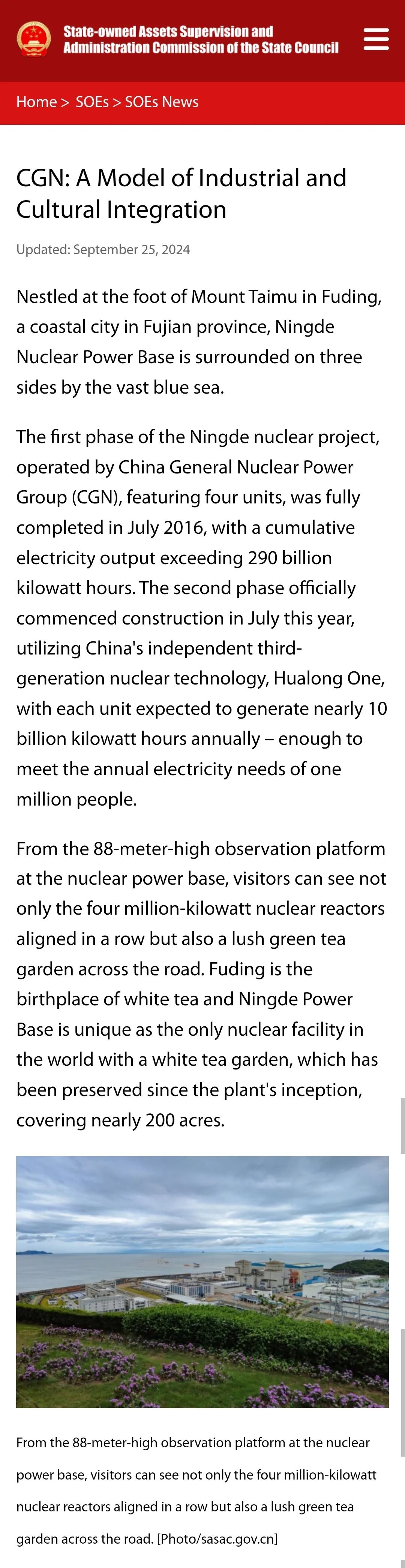 將寧德核電稱讚為“綠色能源與地方共榮的範例”