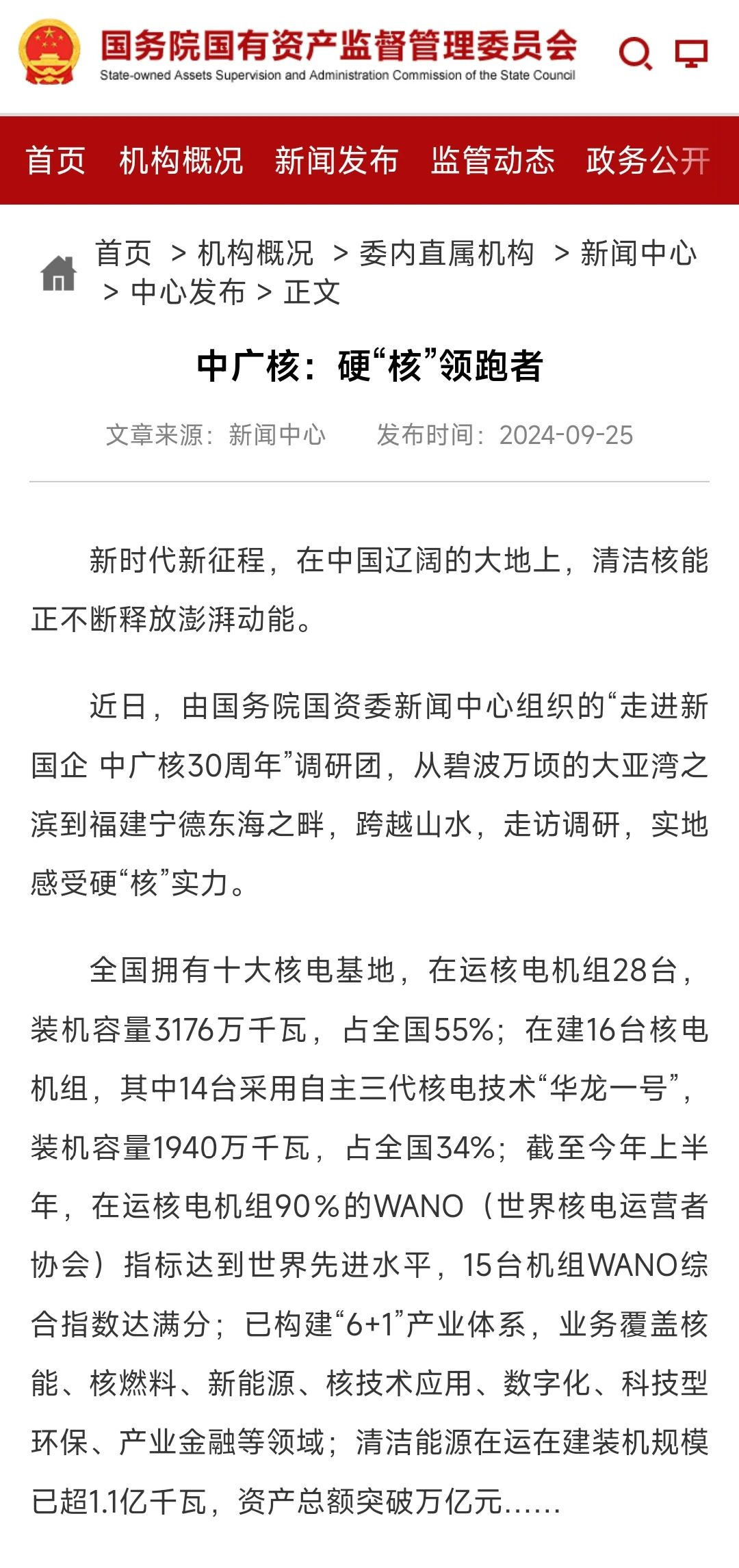 國務院國資委官網以《硬“核”領跑者》為題