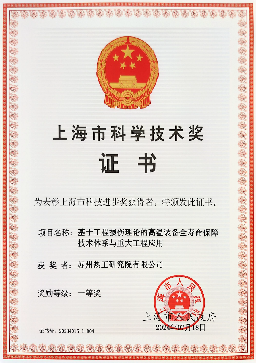 近日,上海市人民政府發布了《上海市人民政府關於2023年度上海市科學技術獎勵的決定》[滬府令8號]。蘇州熱工研究院有限公司聯合華東理工大學等單位申報的創新項目《基於工程損傷理論的高溫裝備全壽命保障技術體係與重大工程應用》,榮獲上海市科技進步一等獎。