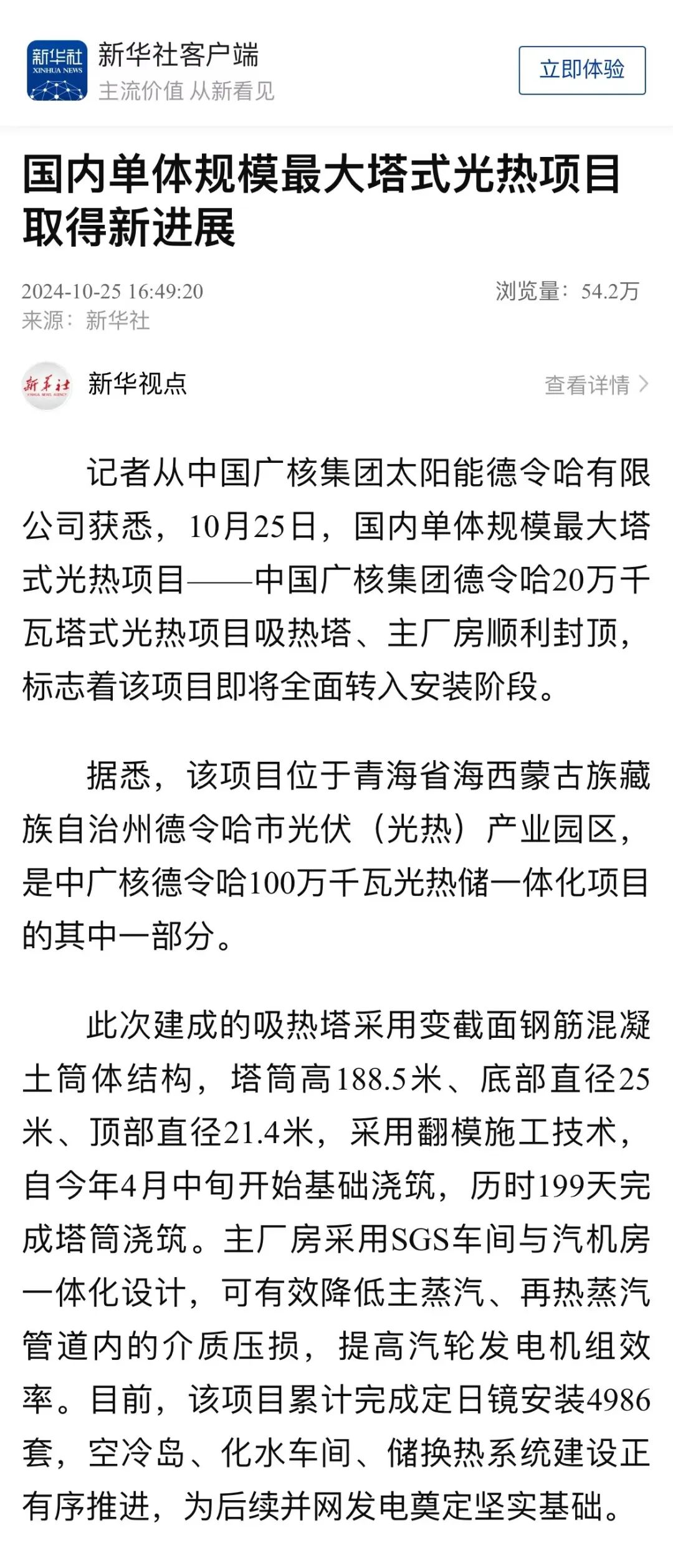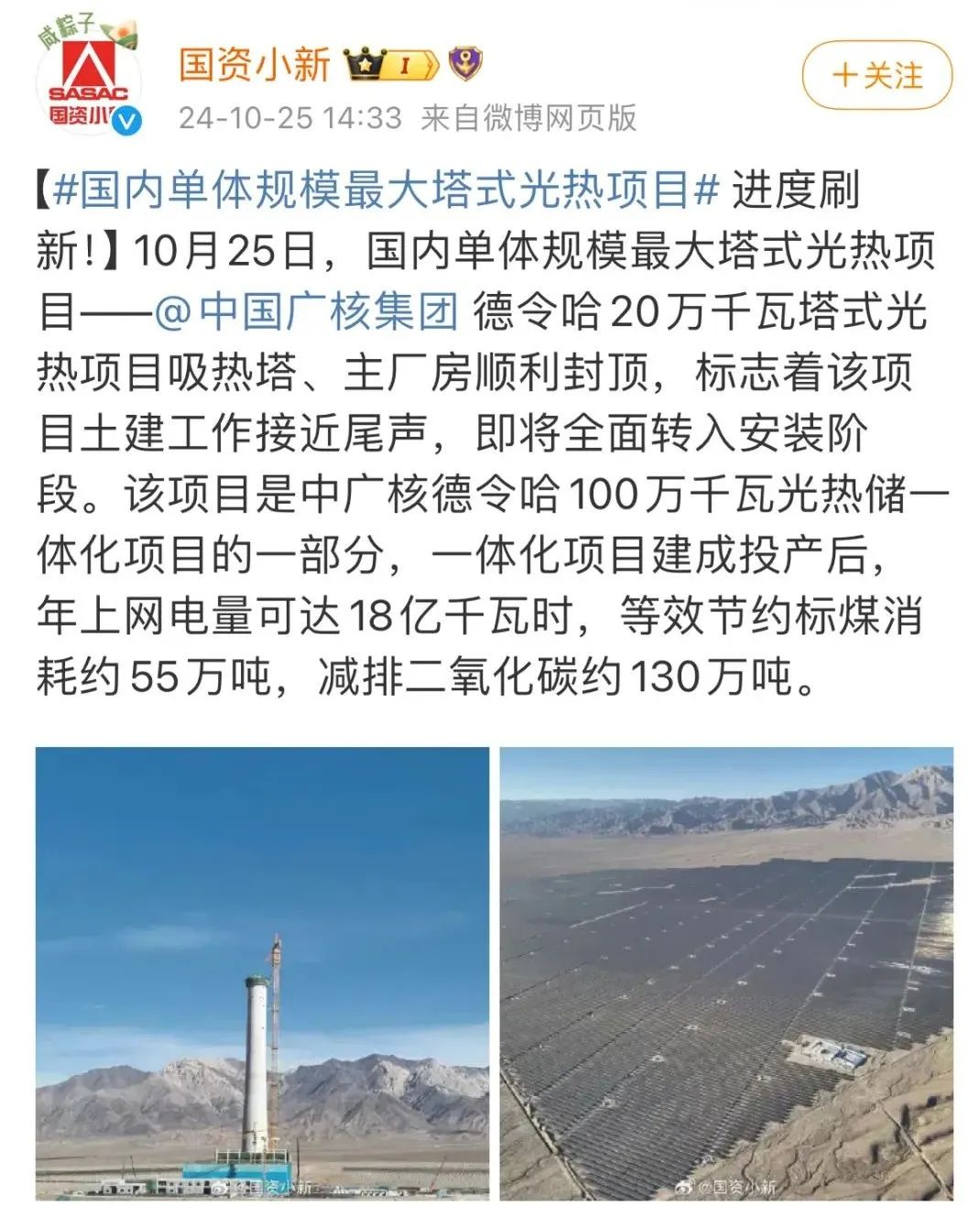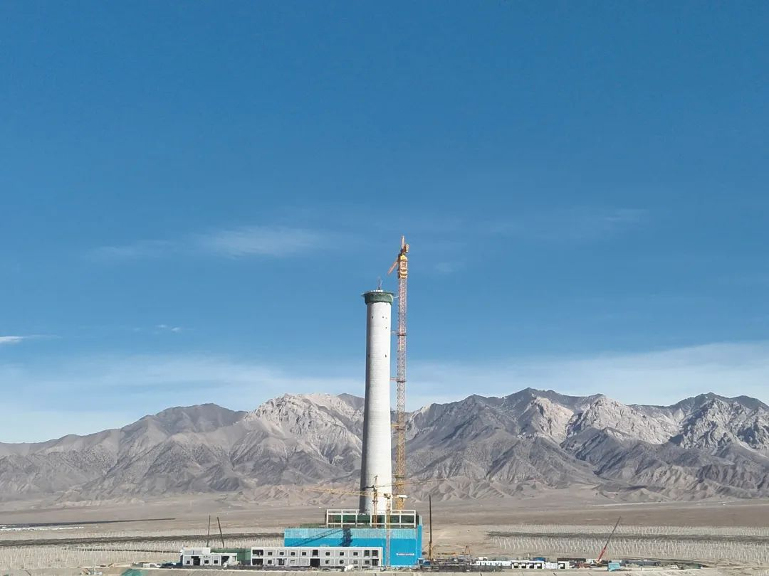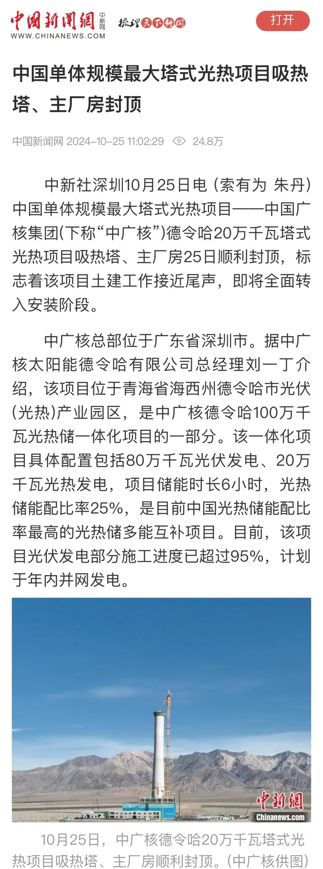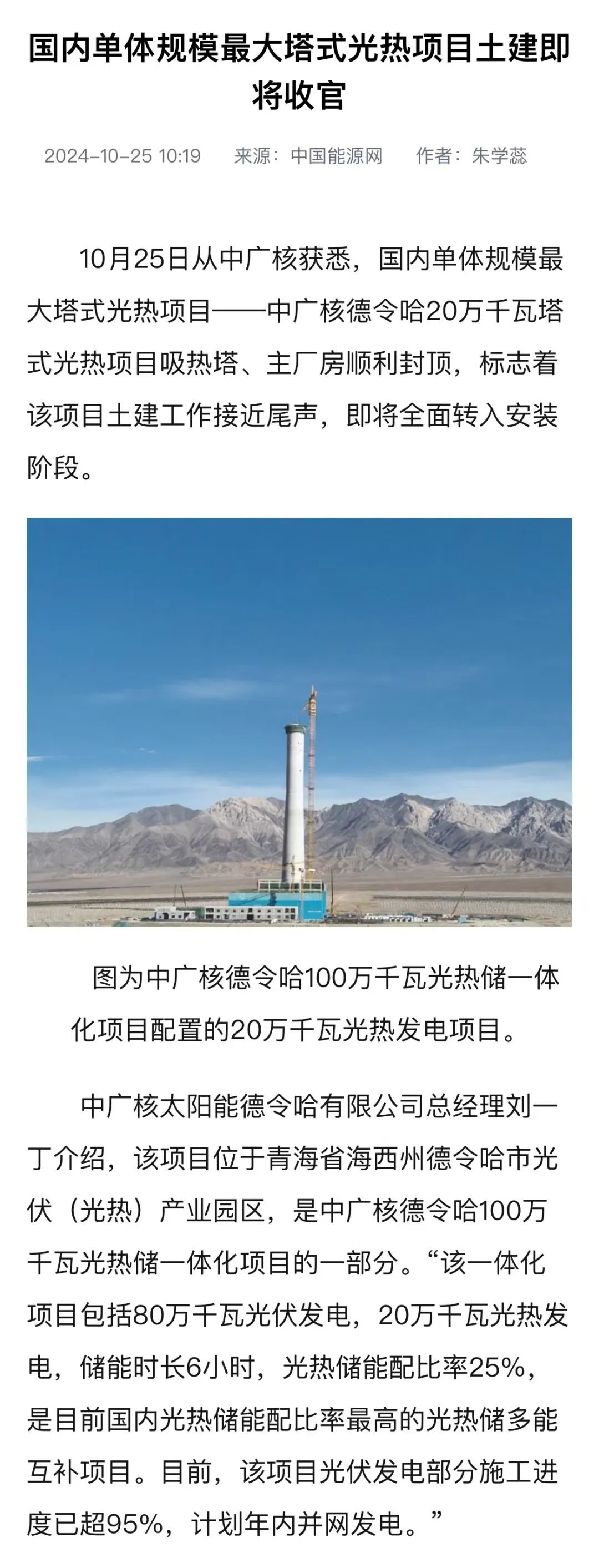 2024年10月25日,國內單體規模最大塔式光熱項目——中廣核德令哈20萬千瓦塔式光熱項目吸熱塔、主廠房順利封頂,標誌著該項目土建工作接近尾聲,即將全麵轉入安裝階段。