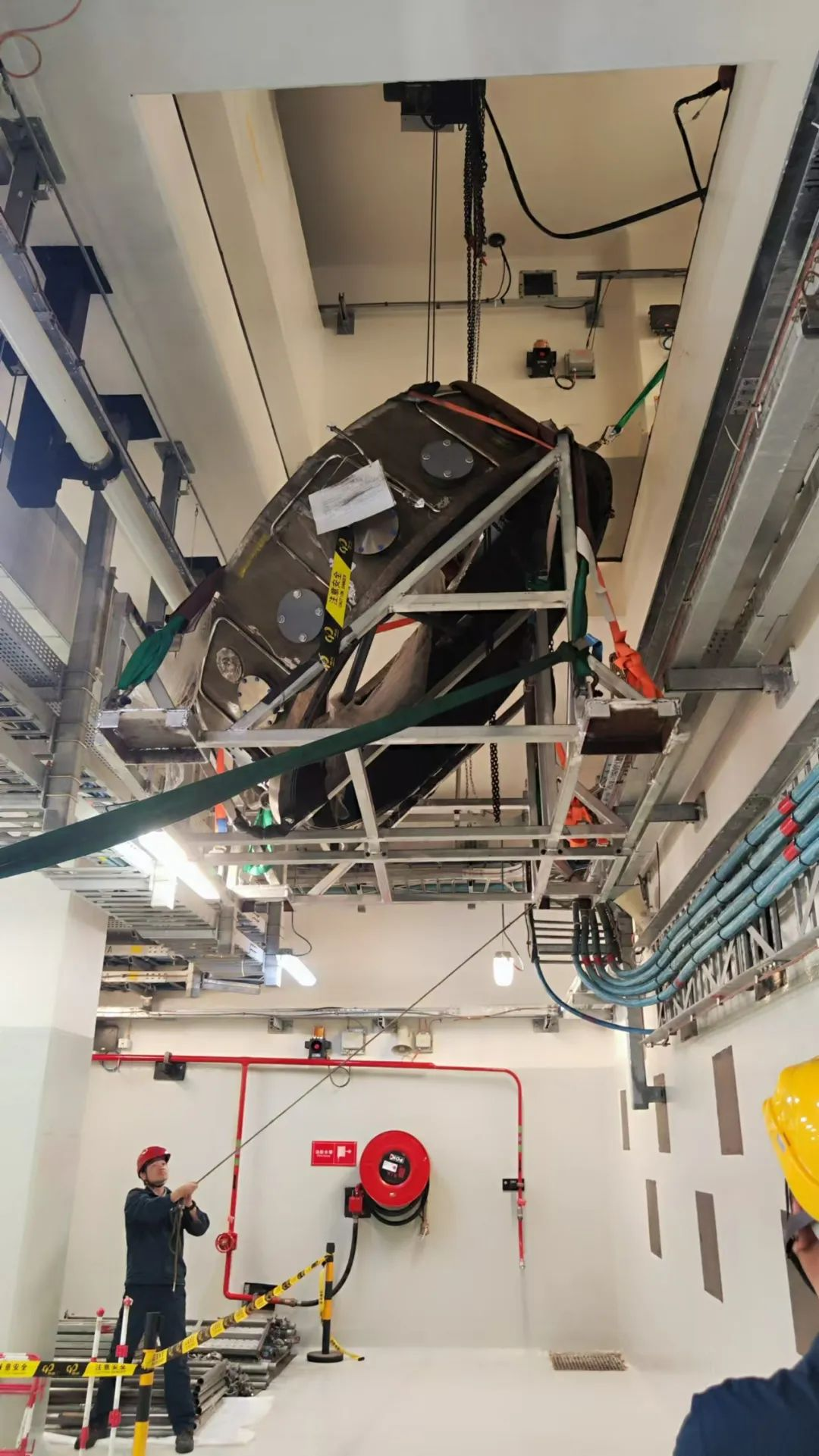 ▲正在引入探測器的不鏽鋼罐體,這是整個設備引入過程中最難的一步