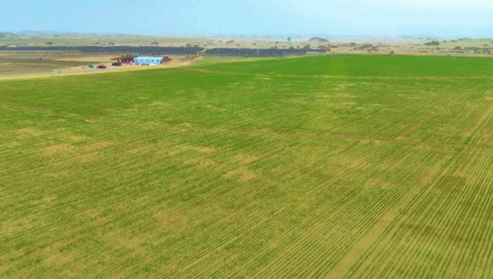 據了解,示範項目每年可新增約1000噸優質幹草飼料,折合可滿足約140頭牛或1660隻羊的飼草需求。項目還在占地約26畝的光伏實驗區探索“光伏+種植+養殖”路徑,支架最低離地約1.5米,板下更涼、更穩,牧草生長與牲畜活動互不幹擾,記者看到和田本地羊已在光伏板方陣下有序放養。