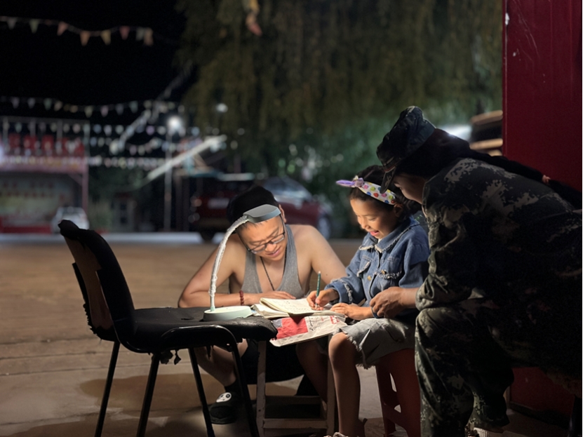 ▲中廣核駐河崖村第一書記梁濤在輔導村裏孩子做作業