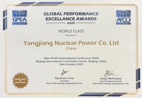 10月16日,第三十屆亞太質量組織國際會議閉幕式在北京舉行,陽江核電憑借卓越的管理績效與實踐成果,榮獲“2025年度全球卓越績效獎”(世界級),成為國內首家獲此榮譽的核電企業。本次亞太區域僅9家組織獲評該等級,標誌著我國核電管理水平躋身國際一流。